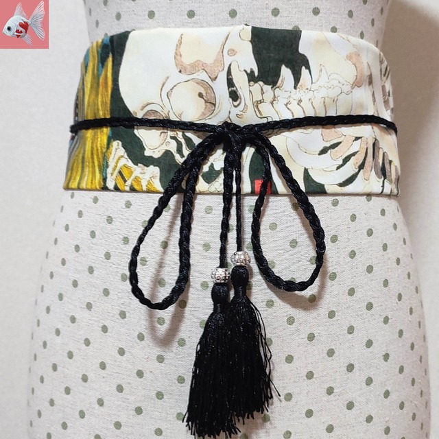 歌川国芳・相馬の古内裏の和装ベルトです。 オリジナルでプリントした生地で、軽くやわらかいので、着用も楽です。 ※ハンドメイド品のため、サイズは5mm前後差が出る場合がございます。 フリーサイズ 布ベルト部分 約69㎝ 縦 約10㎝ 素材 ポリエステル等 着物ベルト がしゃどくろ 浮世絵 髑髏 骸骨 和柄 和装 衣装 サッシュベルト 妖怪 スカル クリックポストで発送予定です。