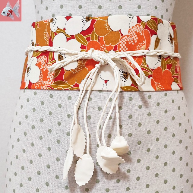 レトロな花柄が可愛い着物リメイクのサッシュベルトです。 赤地にオレンジと白のお花で、葉っぱ飾り付きの合皮の白い紐も素敵です。 やわらかいので着用も楽です。 和装やワンピース等にもオススメです。 ※中古着物(クリーニング済)を使用しており、薄い着色等があります。 ハンドメイド品になりますので、ご理解のある方。 フリーサイズ 布ベルト部分 約69㎝×9.6㎝ 素材 化繊だと思います。 着物ベルト ファブリックベルト 帯ベルト 橙色 飾りベルト 和装ベルト フラワー クリックポストで発送予定です。