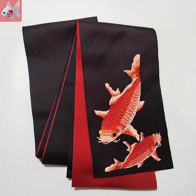 黒と赤の半幅帯に、刺繍で出来た親子の赤い鯉が付いています。 ロングサイズで、浴衣やカジュアル着物向けです。 端のがたつきが少しあるため、アウトレット品です。(3枚目写真) 帯部分サイズ 約17cm×400cm 素材 化繊 大人用 ※多少の作りの粗い部分もございますので、ご理解いただける方。 コイ carp 魚 浴衣帯 半巾帯 ブラック レッド 長尺 クリックポストで発送予定です。