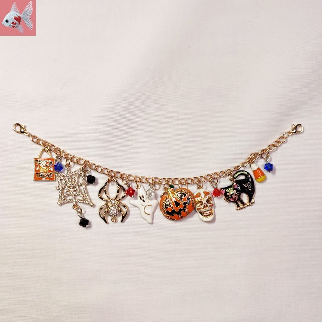 ハロウィンの飾りがたくさん付いた羽織紐アクセサリーです。 おばけ、猫、カボチャ、クモ等、キラキラした飾りがとても可愛いです。 金属カラー ゴールド サイズ 約19cm 素材 合金 ラインストーン ビーズ等 ※多少作りの粗い部分もございますので、ご理解いただける方。 halloween ファンタジー 和装小物 羽織りひも 着物