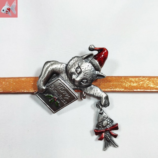 可愛いサンタ帽子をかぶった猫の帯留め飾りです。 リボンの付いた魚とクリスマスカードを持っています。 帯締めを裏の金具に通して使っていただくタイプです。 金属カラー 暗めの シルバー サイズ 約6.9㎝×5㎝ 材質 合金 ※ブローチの加工品になります。 金具は接着しますので、取り外しは出来ません。 多少の作りが粗い部分もございますので、ご理解いただける方。 Christmas Xmas 和装小物 ネコ キャット Cat 帯どめ 帯飾り 着物 クリックポストで発送予定です。