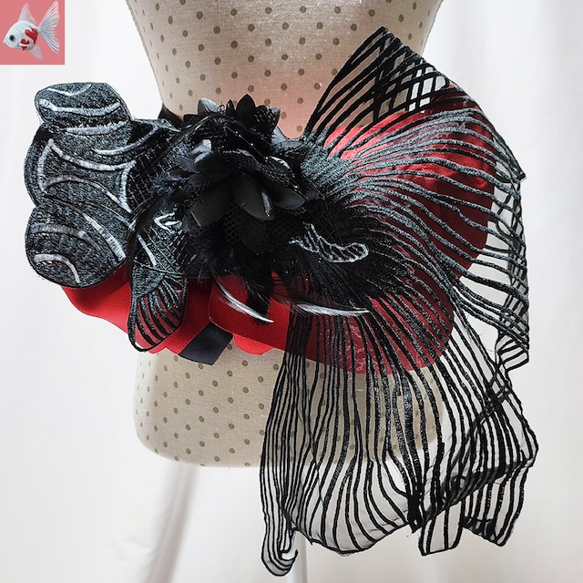 ビッグサイズの黒い金魚の帯飾りです。 かなりの大きさの金魚で、鱗の部分が立体の薔薇になっています。 スポンジのような素材の薔薇で軽いです。 裏にクリップが付いているので、帯に付けたり、その他好きなところに付けてください。 ※多少作りの粗い部分もございますので、ご理解いただける方。 写真の帯は含まれません。 サイズ 約50cm×60cm (広げた状態) 素材 ポリエステル等 大人用 ゴールドフィッシュ きんぎょ 着物 ブラック 花 バラ 舞台衣装 コスチューム 浴衣 帯かざり 和装小物