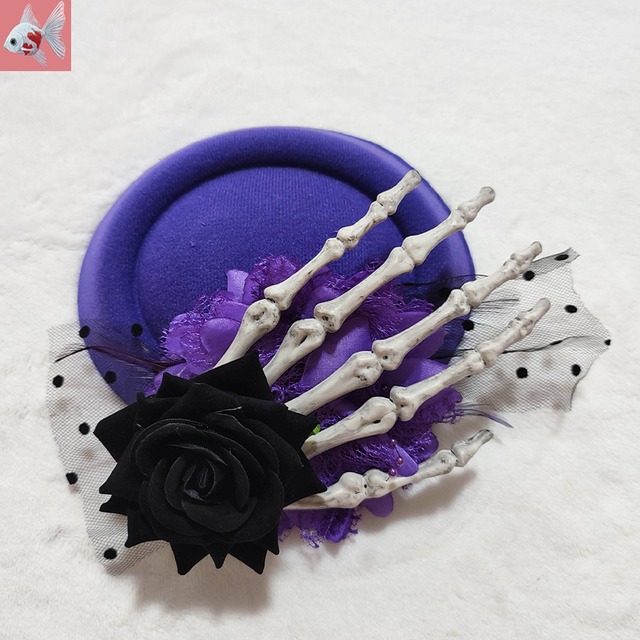 紫のミニハットに、スカルの手と黒い薔薇飾りが付いています。 お花やリボンも付いて可愛いです。 裏側のクリップで留めて着用します。 ハットのサイズ 約16cm×13cm ※多少作りの粗い部分もございますので、ご理解いただける方。 髪飾り ぼうし 帽子 むらさき ハロウィン Halloween ヘッドドレス ヘアクリップ ガイコツ skull 衣装 普通郵便で発送予定です。