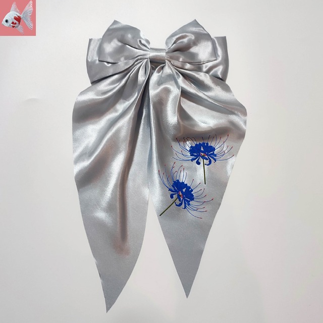 青い彼岸花がプリントされた、グレーのサテンのビッグリボンです。 バレッタになっています。 ※多少作りの粗い部分もございますので、ご理解いただける方。 サイズ 約38cm × 19cm 素材 ポリエステル ヒガンバナ シルバー 銀色 曼珠沙華 ブルー Spider lily 髪飾り 衣装 ヘアアクセサリー クリックポストで発送予定です。