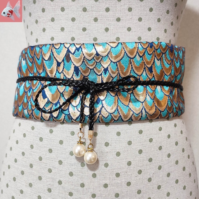 美しい孔雀の羽根柄の素敵なサッシュベルトです。 金色と水色の羽根が美しい織物生地で、合皮の紐にパール飾りが付いて可愛いです。 着物の帯締め代わりにしたり、洋装、コスプレ等にもオススメです。 ※ハンドメイド品になりますので、ご理解のある方。 フリーサイズ 布ベルト部分 約67㎝ 縦 約9㎝ 素材 化繊等 飾りベルト ゴールド peacock ピーコック クジャク 和装ベルト ファブリックベルト 青 ブルー クリックポストで発送予定です。