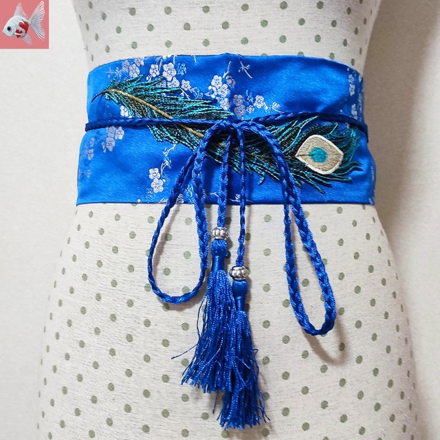 美しい孔雀の羽根とお花柄のサッシュベルトです。 紐はパール付で黒の合皮です。 とても軽くてやわらかく、着用も楽です。 和装、洋装、衣装にもオススメです。 ※ハンドメイド品になりますので、ご理解のある方。 フリーサイズ 布ベルト部分 約68.5㎝ 縦 約9.6㎝ 素材 綿等 ファブリックベルト 紫 水色 飾りベルト peacock クジャク 和柄 クリックポストで発送予定です。