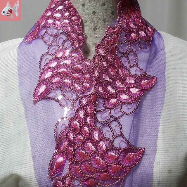 とても美しいクジャクの羽レースの半襟です。 細かいスパンコールと刺繍がとても綺麗です。 羽先を見せたいので、表側だけに付ける半襟になります。 振袖やアンティーク着物、和装の衣装にもオススメです。 ※多少作りの粗い部分もございますので、ご理解いただける方。 カラー パープル系 サイズ 約100cm × 11cm 素材 ポリエステル スパンコール 紫 むらさき peacock ピーコック 孔雀 くじゃく 半衿 半えり 重ね衿 羽根 キラキラ クリックポストで発送予定です。