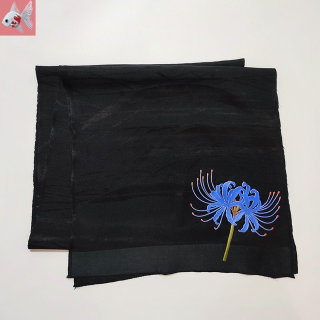 青い彼岸花がプリントされた、黒い帯揚げです。 帯飾りやぷち兵児帯にしたり、しごき帯のように使ったり、好きなようにお使いください。 地模様があり、絽の夏用です。 ※中古の帯揚げを使っています。 目立つダメージ等はないですが、小傷がございます。 サイズ 約164cm×29cm 帯揚げの素材 不明 帯あげ 和装小物 ヒガンバナ 着物 ブラック 曼珠沙華 Spider lily 衣装 クリックポストで発送予定です。