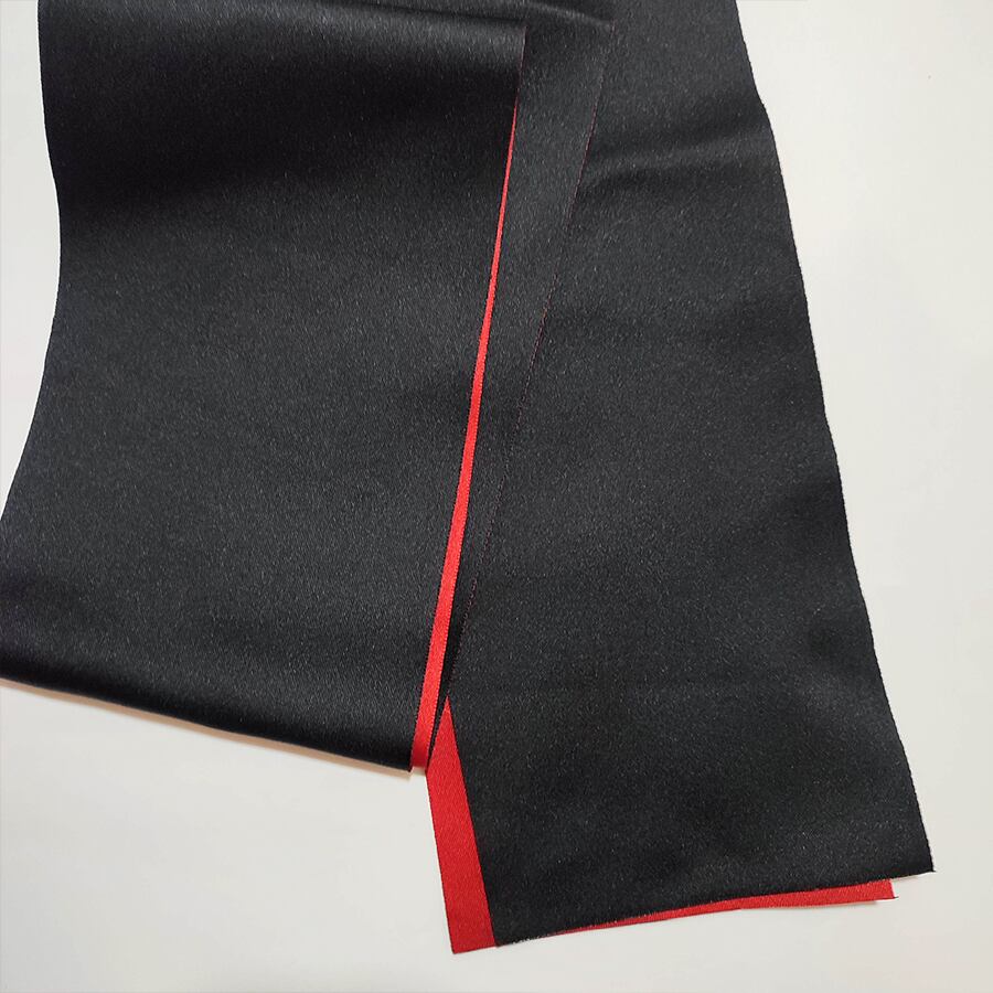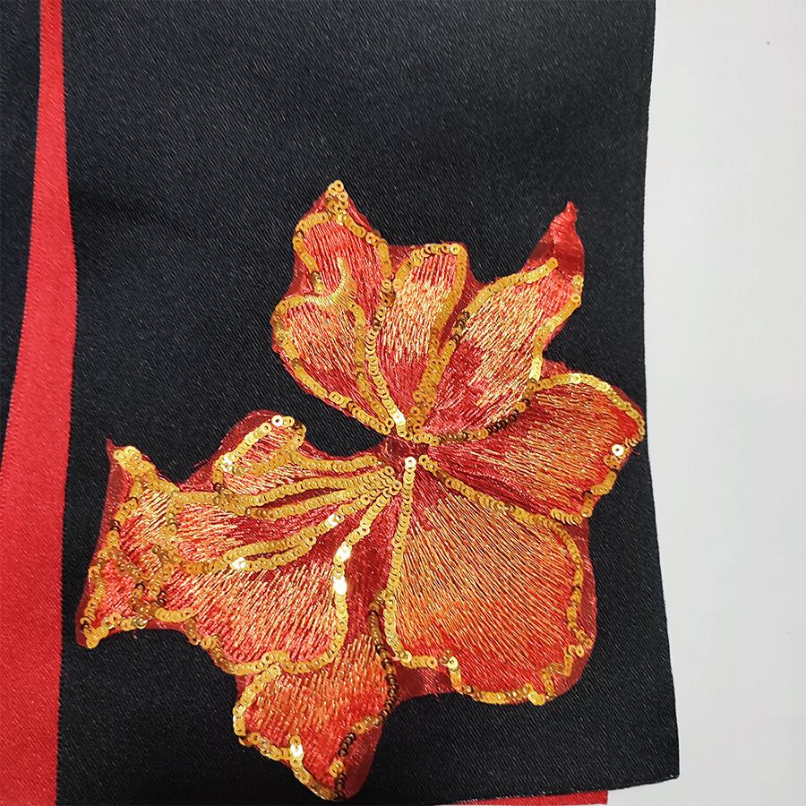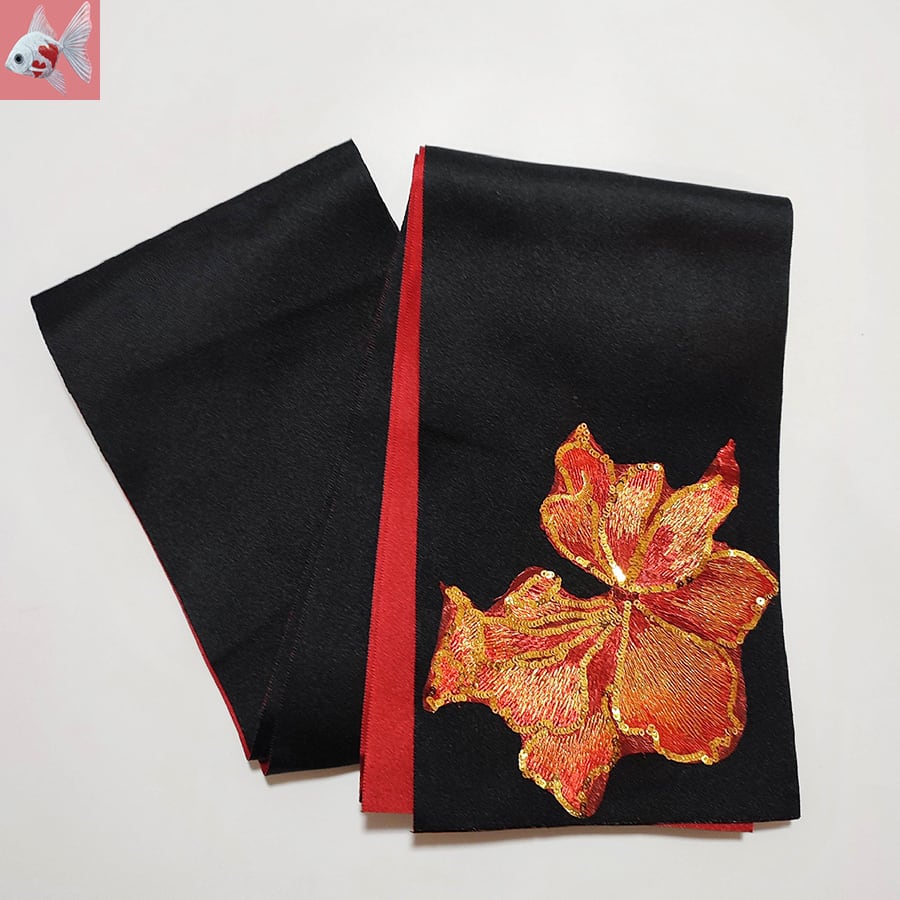 黒と赤の半幅帯に、スパンコールと刺繍の花飾りが付いています。