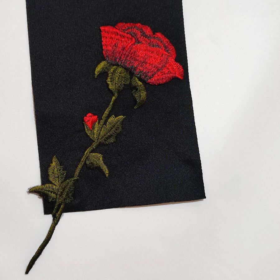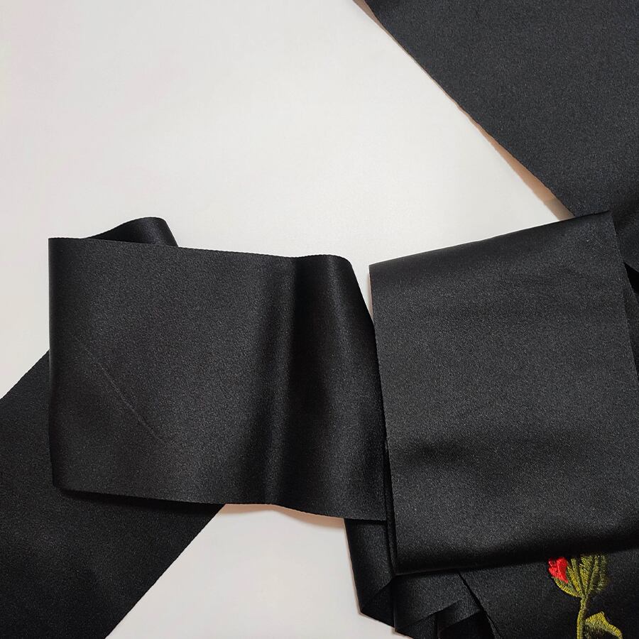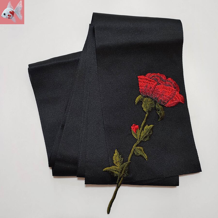 両面黒の半幅帯に、赤い薔薇の刺繍飾りが付いています。