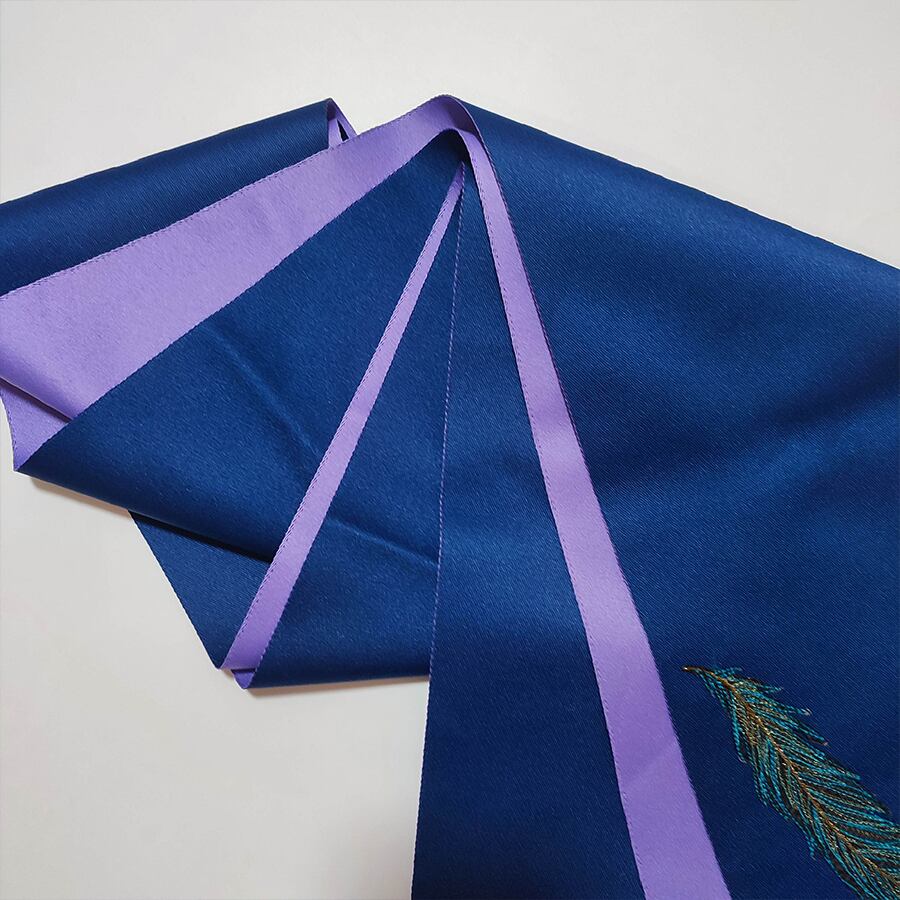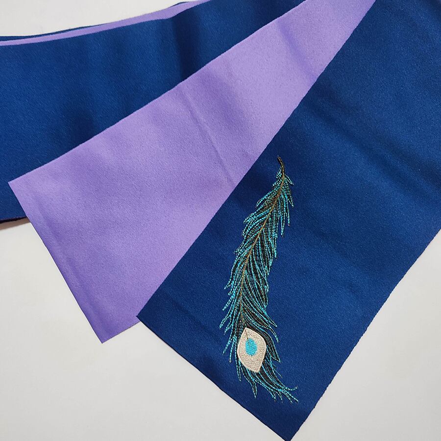 紺と紫の半幅帯に、青の孔雀の羽根の刺繍飾りが付いています。
