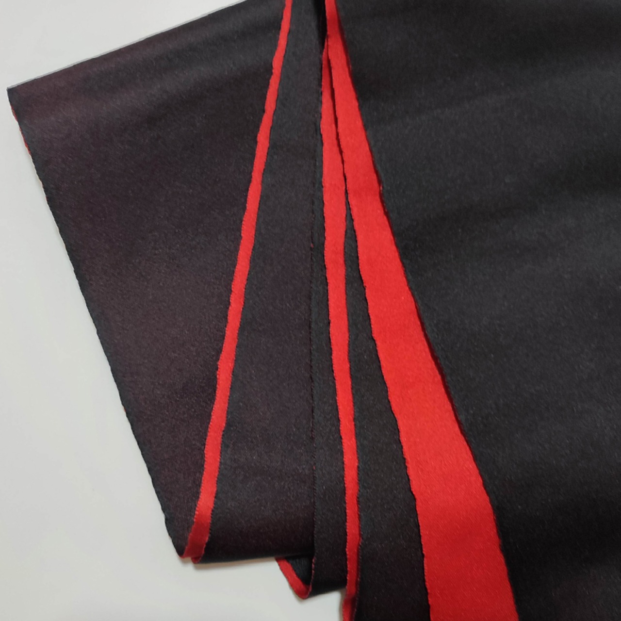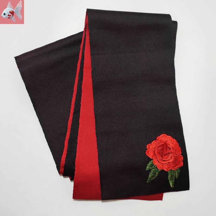 黒と赤の半幅帯に、立体の赤い薔薇の刺繍飾りが付いています。