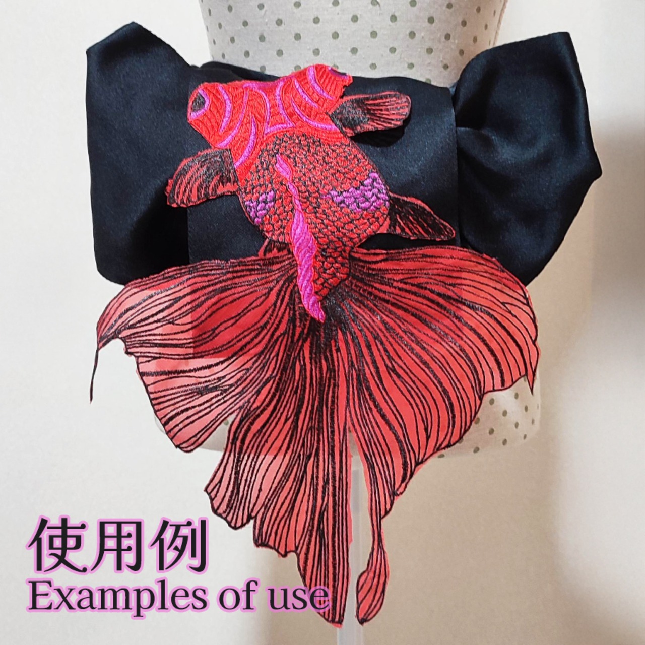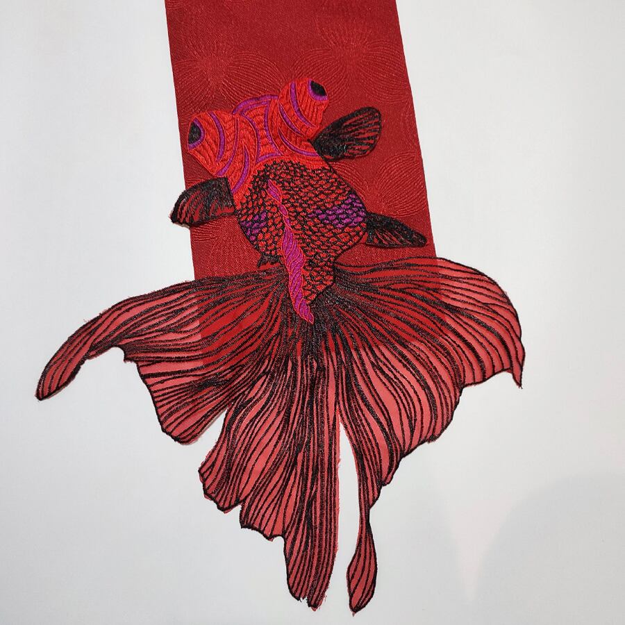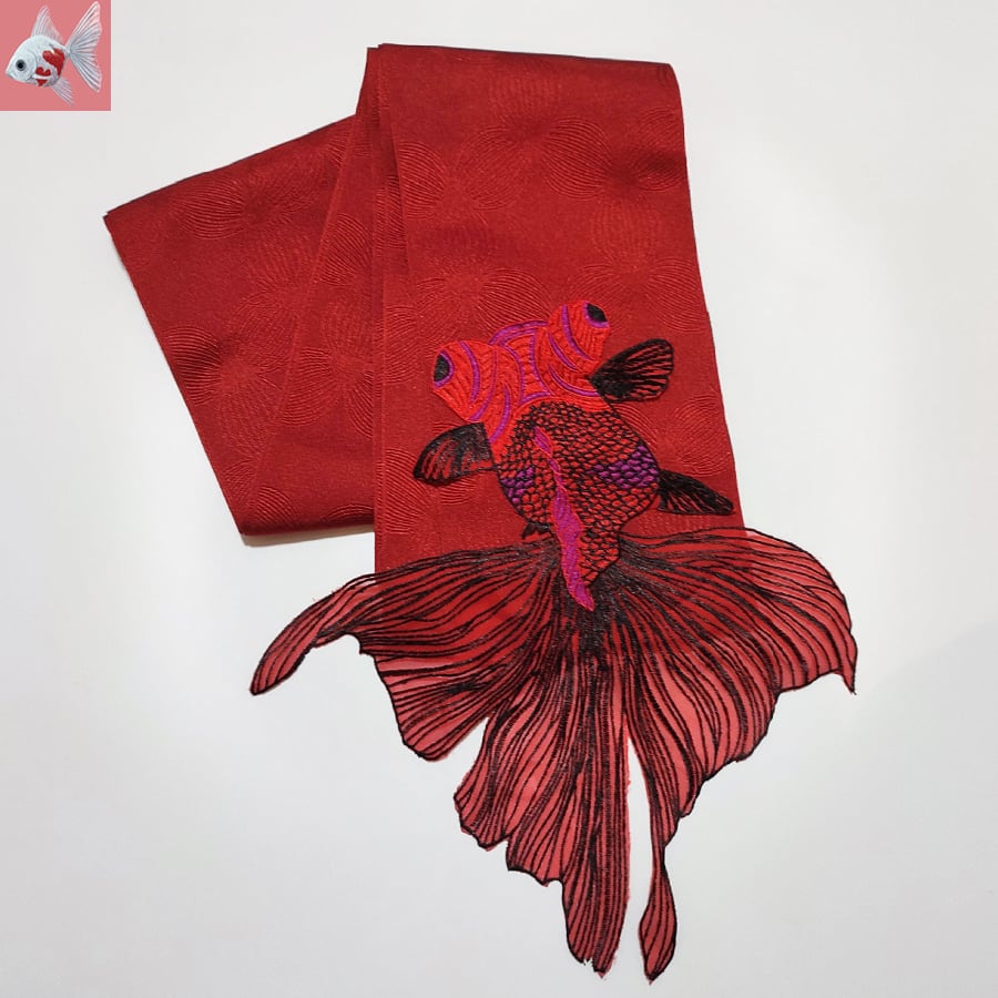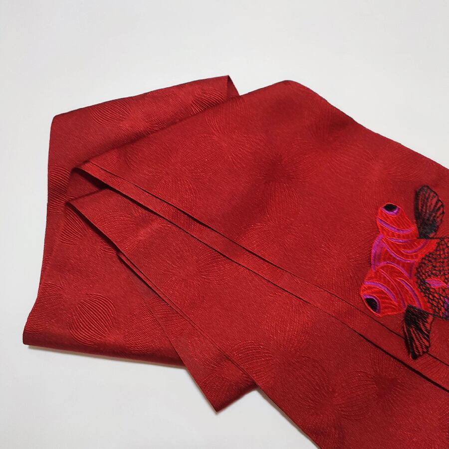 赤の半幅帯に、刺繍で出来た大きな金魚が付いています。