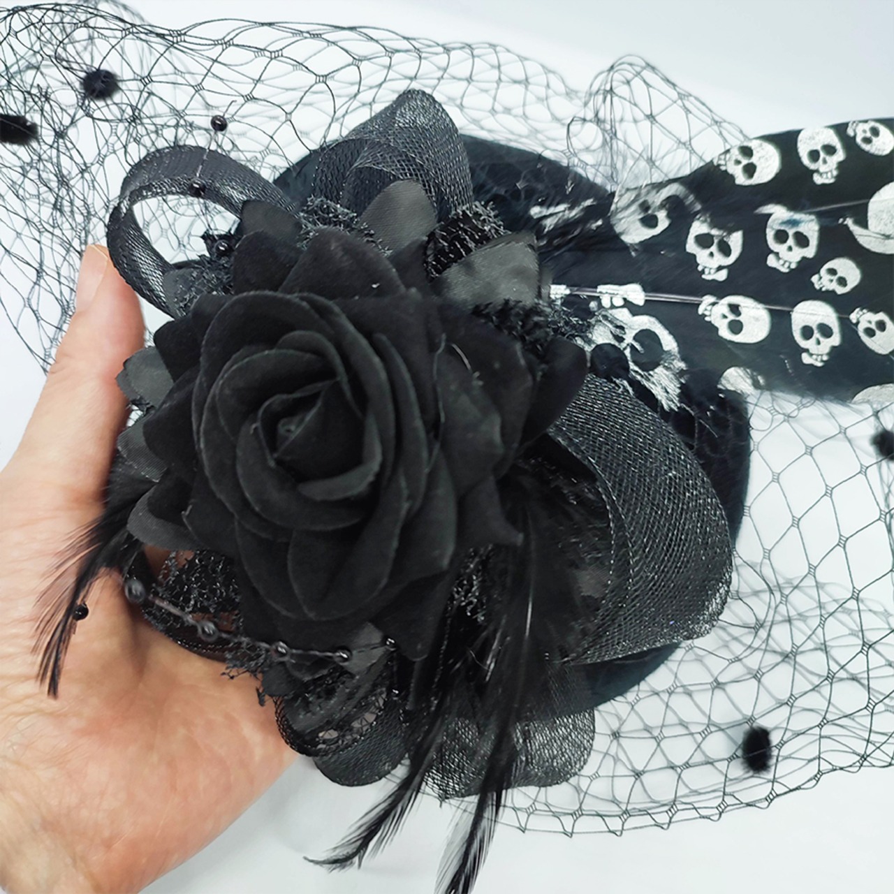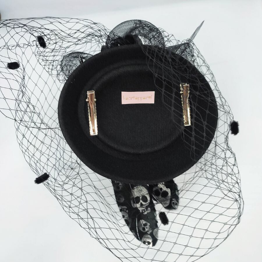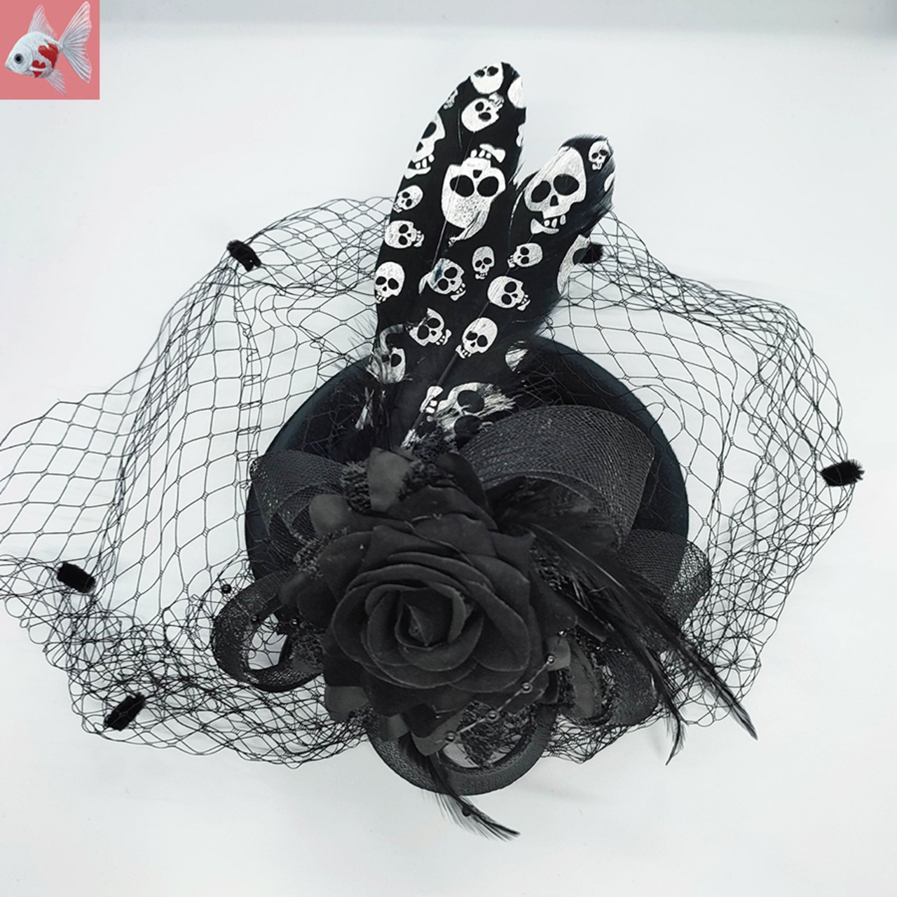 ベールが付いた黒のミニハットに、黒い薔薇やスカル柄の羽根飾りが付いています。