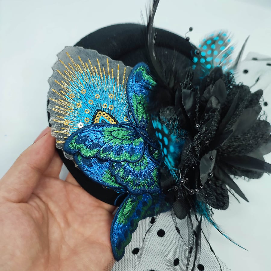 黒のミニハットに、ブルーの蝶と孔雀の羽根の刺繍の羽根飾りが付いています。
