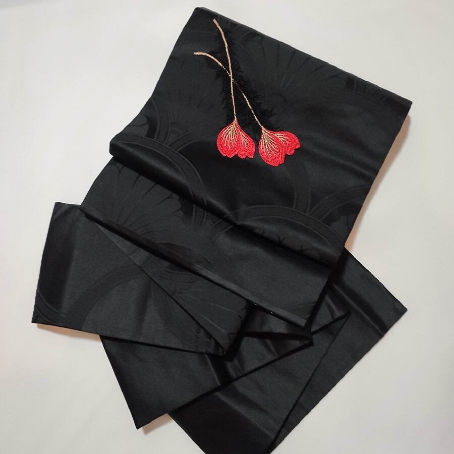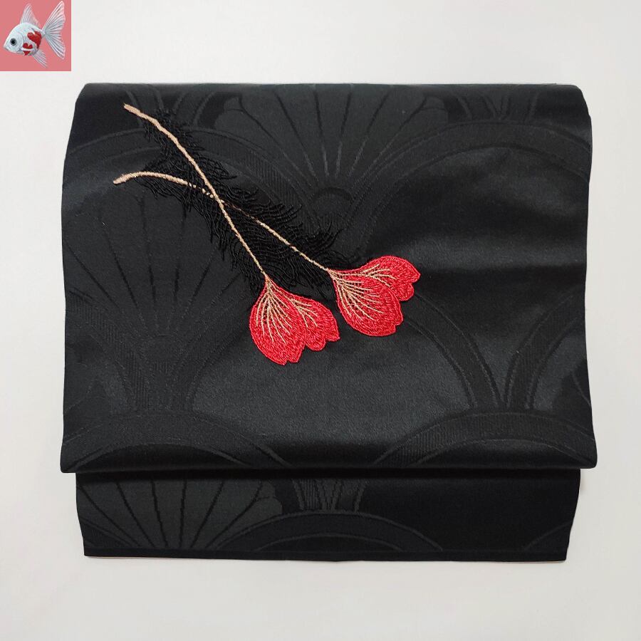 赤い鳳凰のような羽根の刺繍飾りが付いた、黒の名古屋帯です。