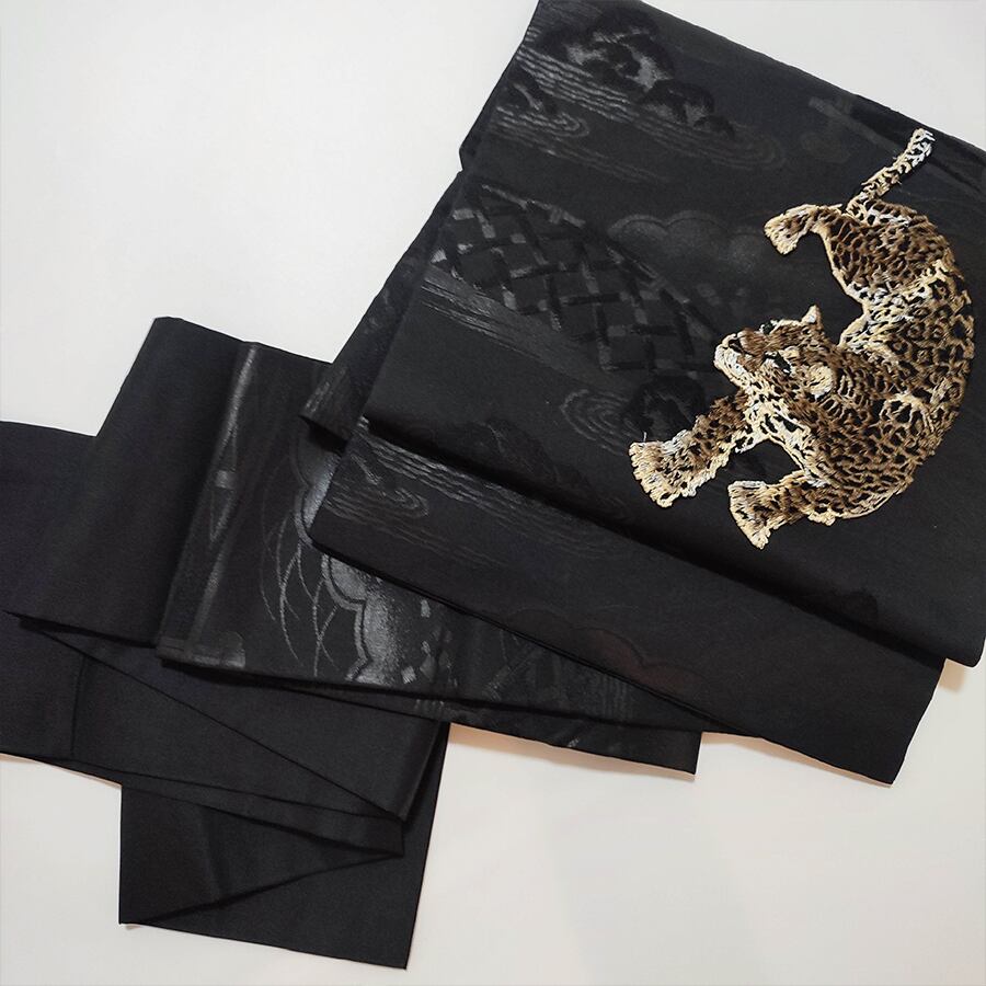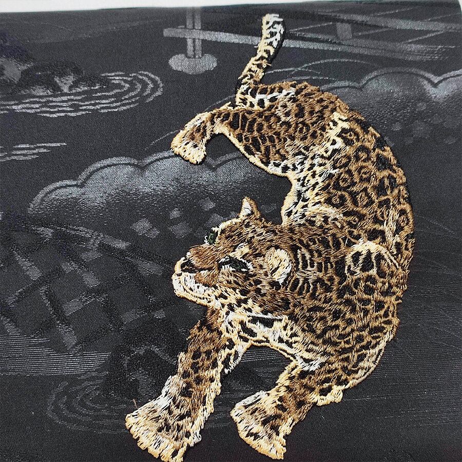 刺繍で出来た可愛い豹が付いた、黒の名古屋帯です。