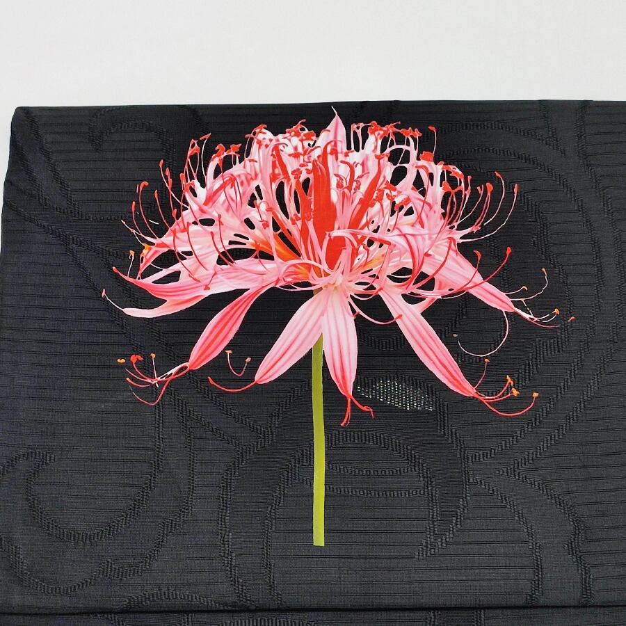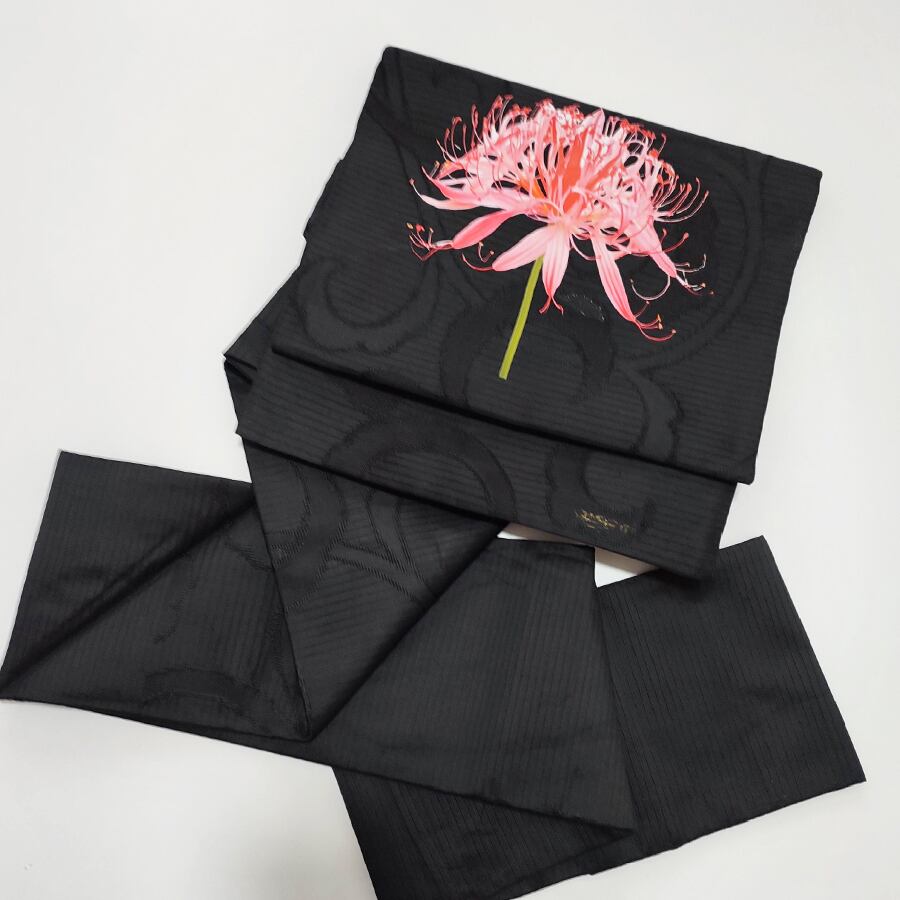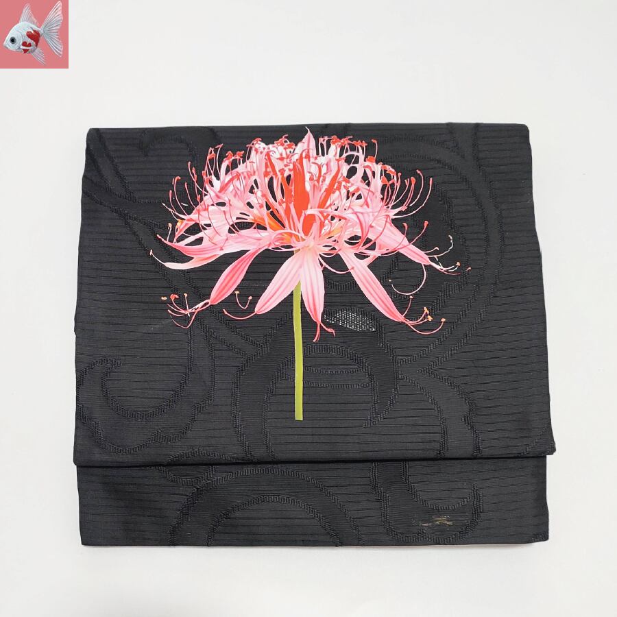 薄い赤色の彼岸花がプリントされた、黒の名古屋帯です。