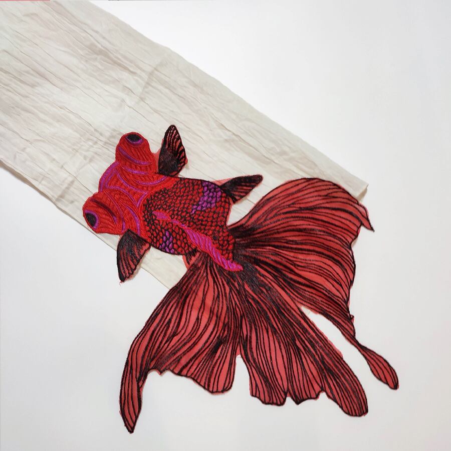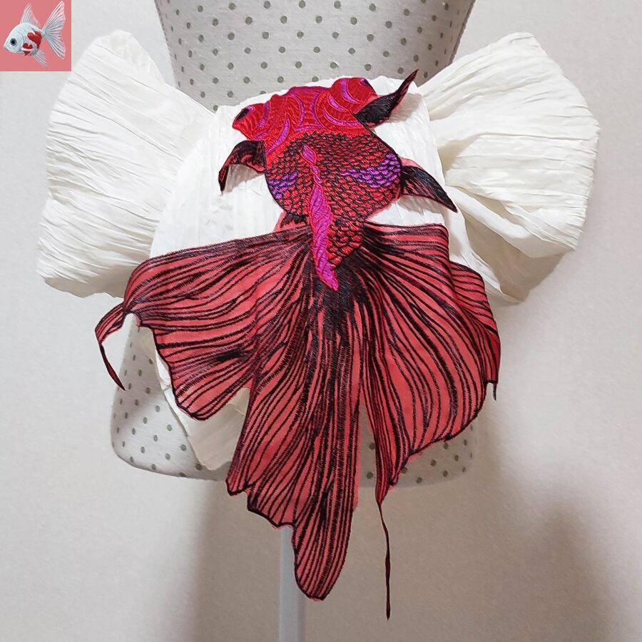 オフホワイトの兵児帯に、刺繍で出来た赤い大きな金魚が付いています。