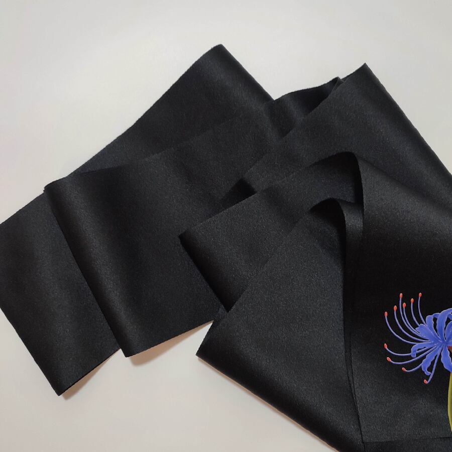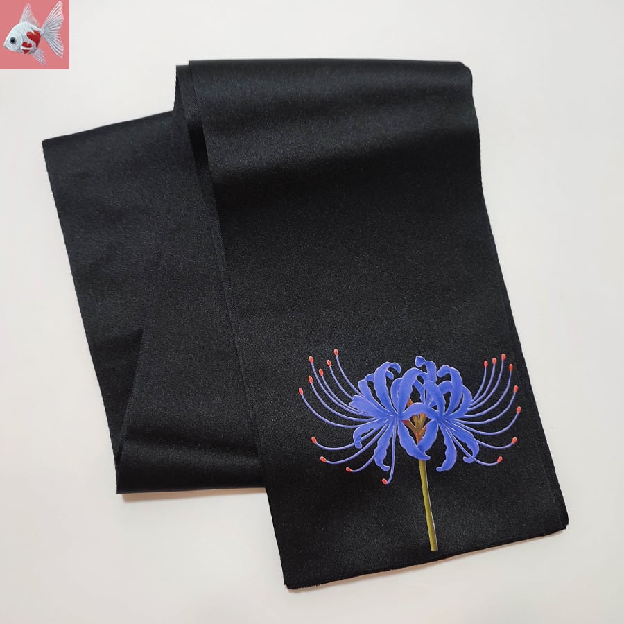 青い彼岸花がプリントされた、両面黒の半幅帯です。