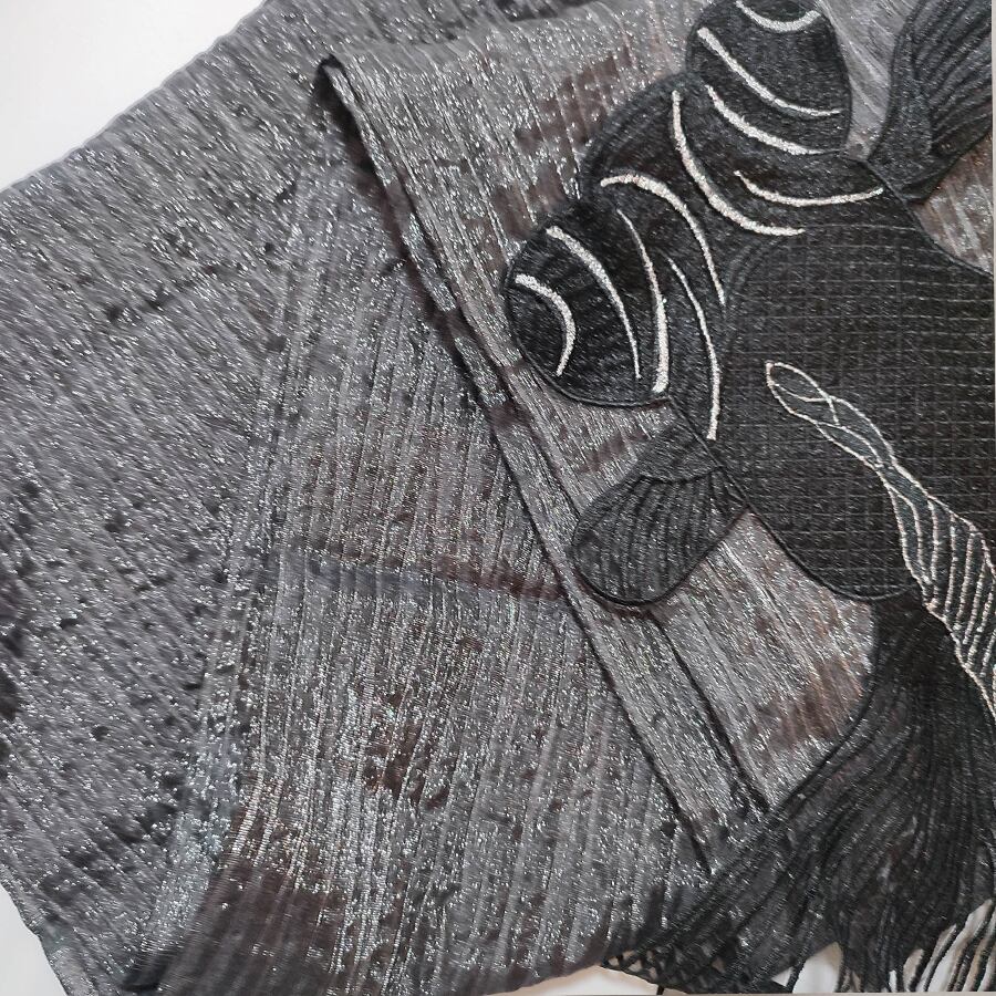 黒の兵児帯に、刺繍で出来た大きな黒い金魚が付いています。