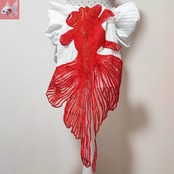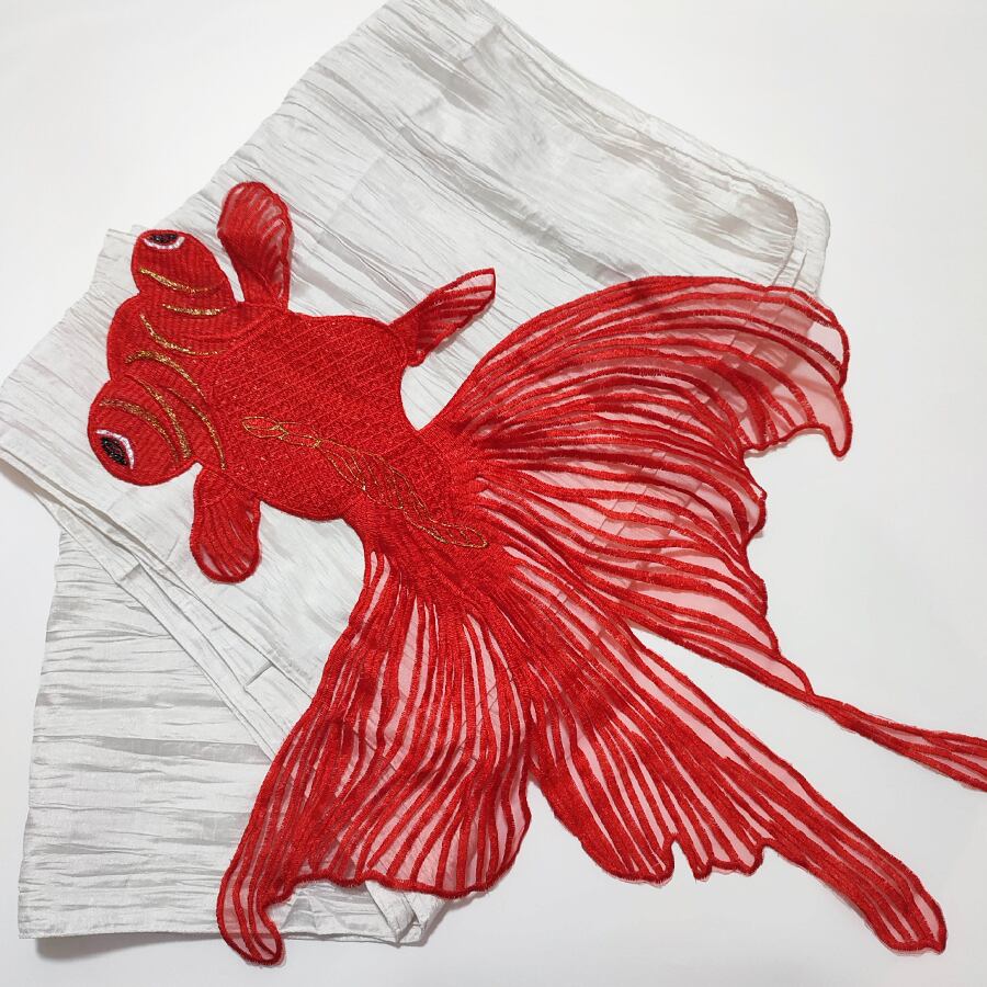 オフホワイトの兵児帯に、刺繍で出来た大きな赤い金魚が付いています。