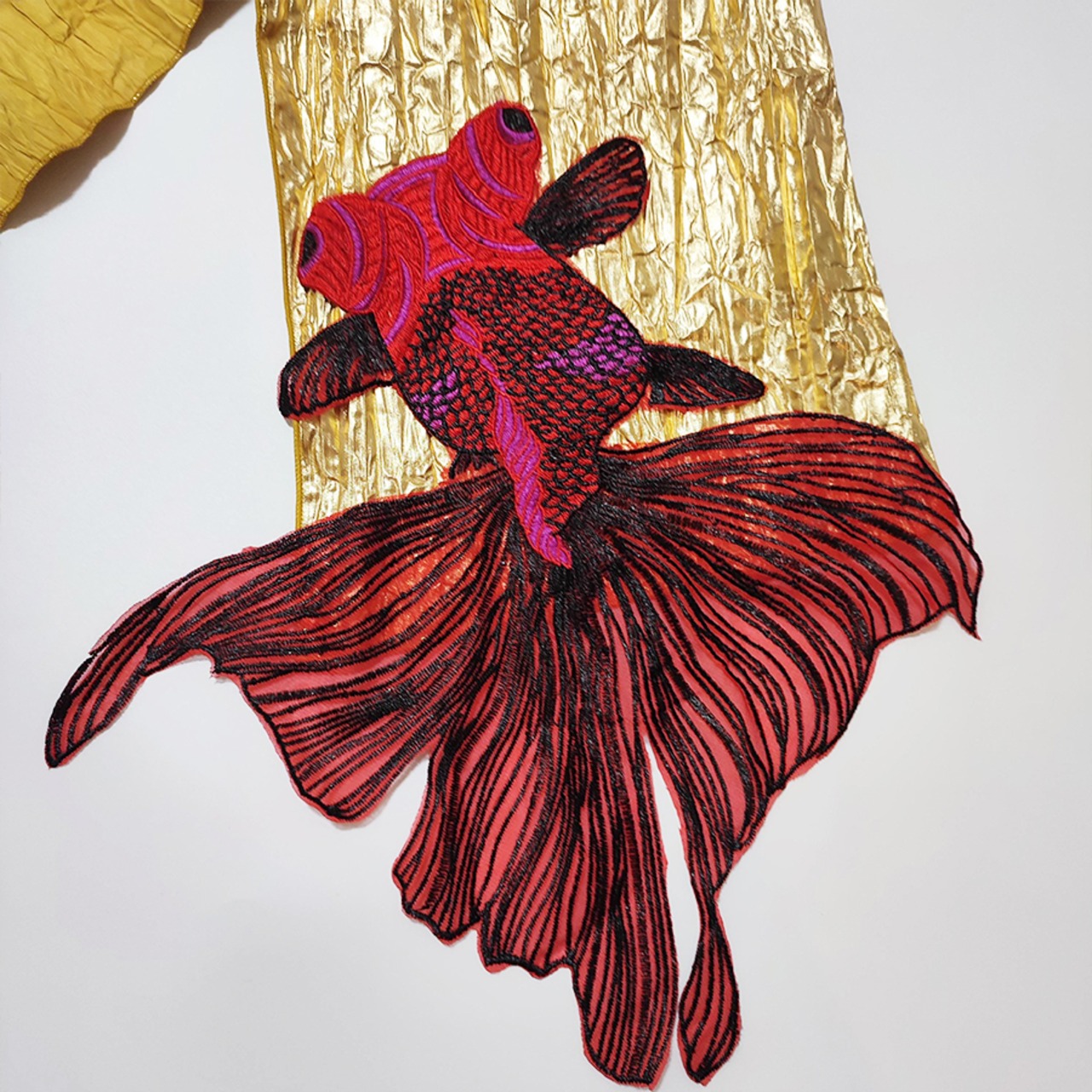 メタリックゴールドの兵児帯に、刺繍で出来た大きな金魚が付いています。