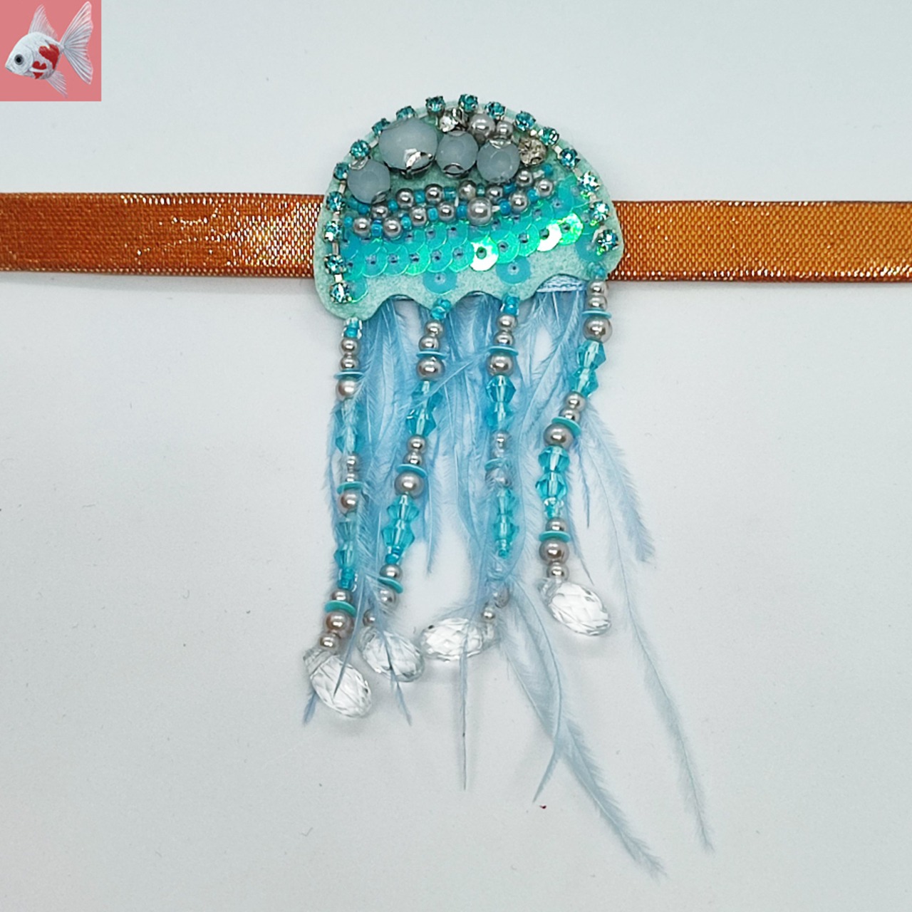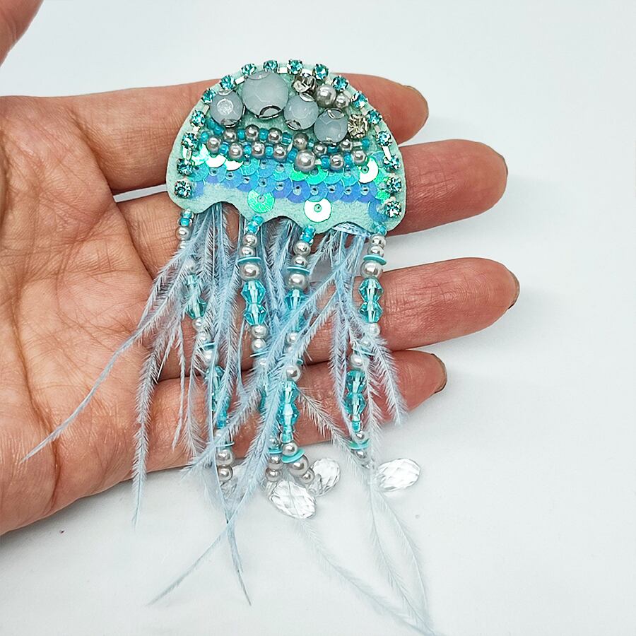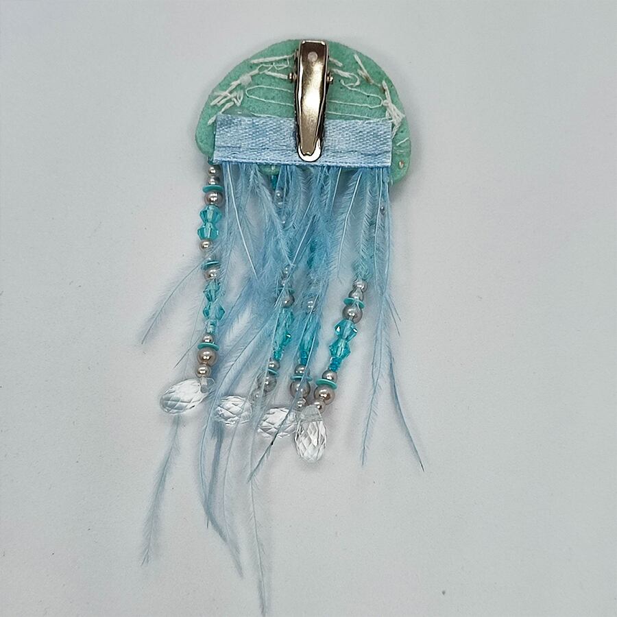 キラキラのビーズやスパンコールが付いた、水色のクラゲの帯留め飾りです。