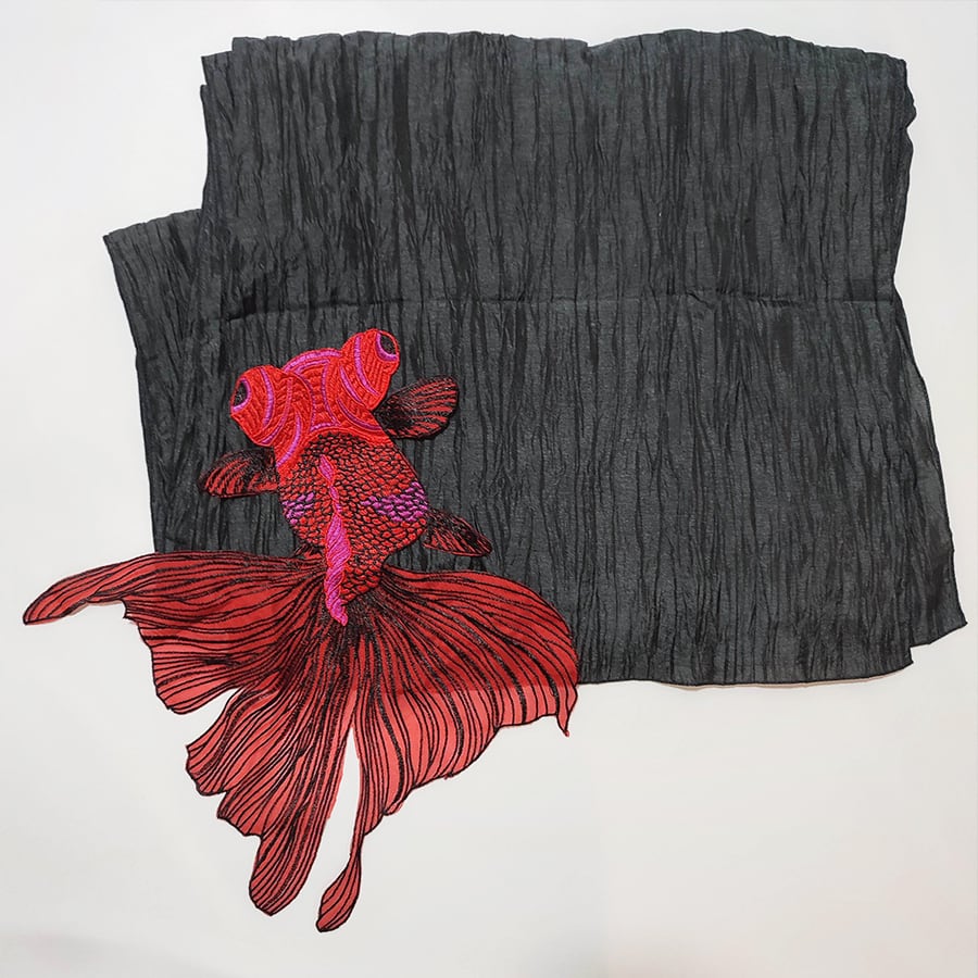 チャコールグレーの兵児帯に、刺繍で出来た大きな金魚が付いています。