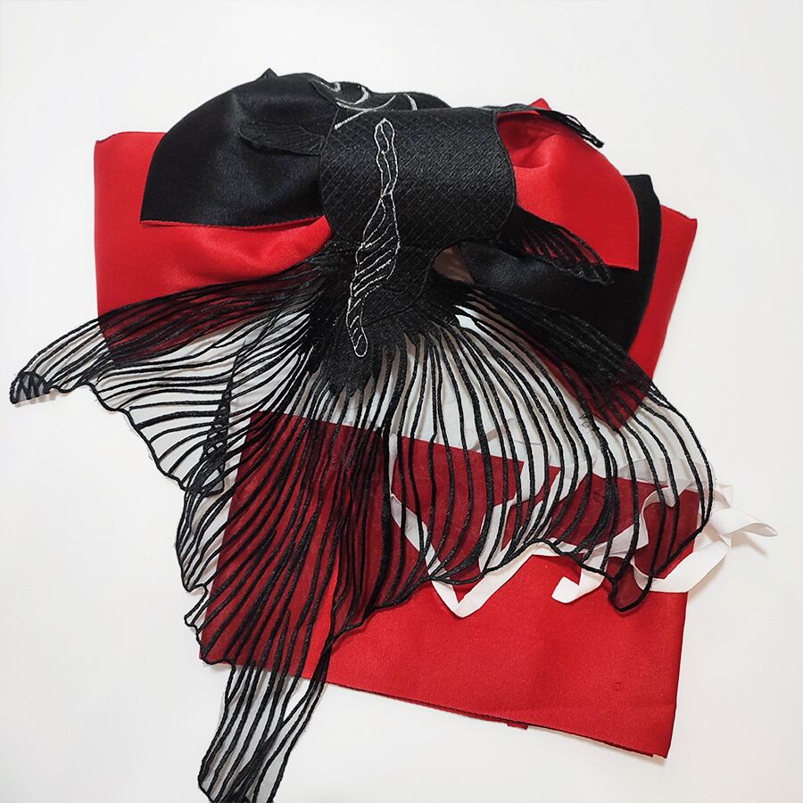 赤と黒の浴衣用作り帯に、刺繍で出来た大きな黒い金魚が付いています。