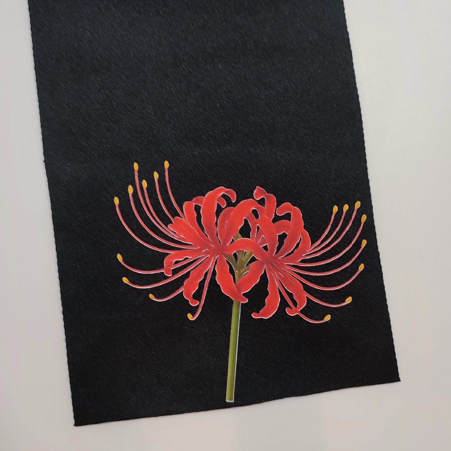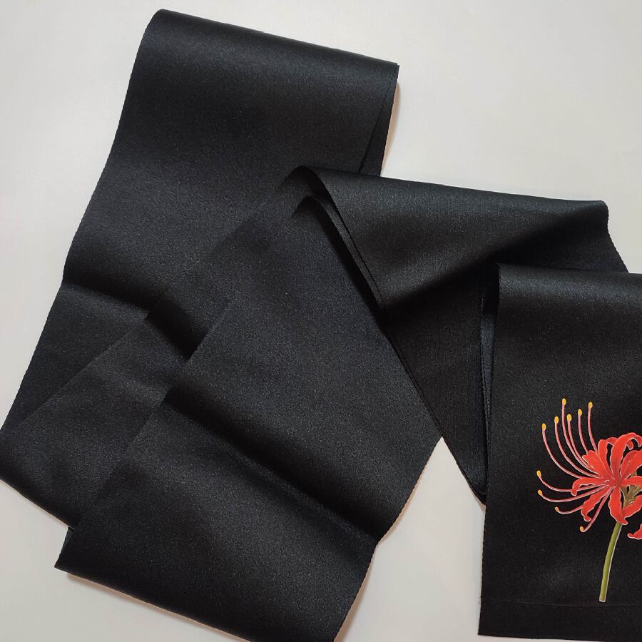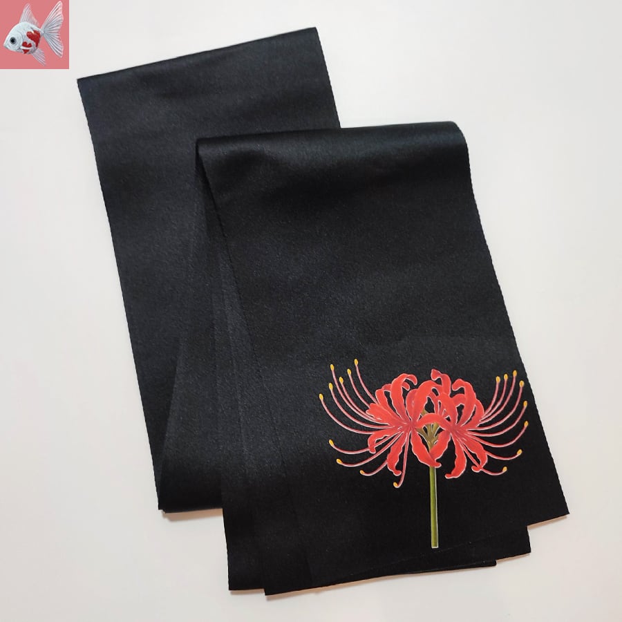 赤い彼岸花がプリントされた、両面黒の半幅帯です。