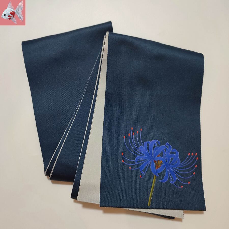 青い彼岸花がプリントされた、紺と薄グレーの半幅帯です。