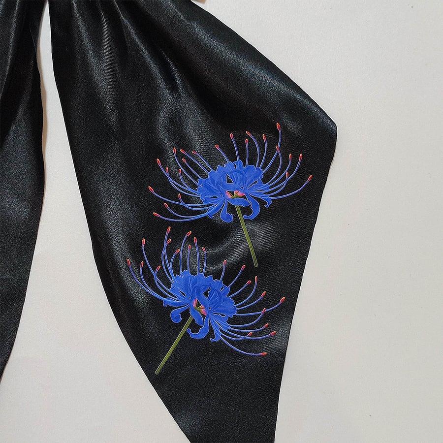 青い彼岸花がプリントされた、黒のサテンのビッグリボンです。
