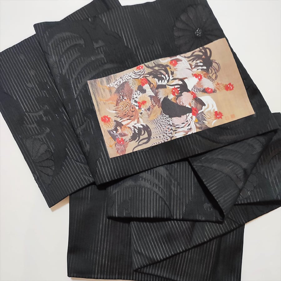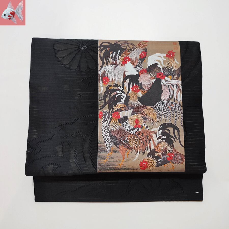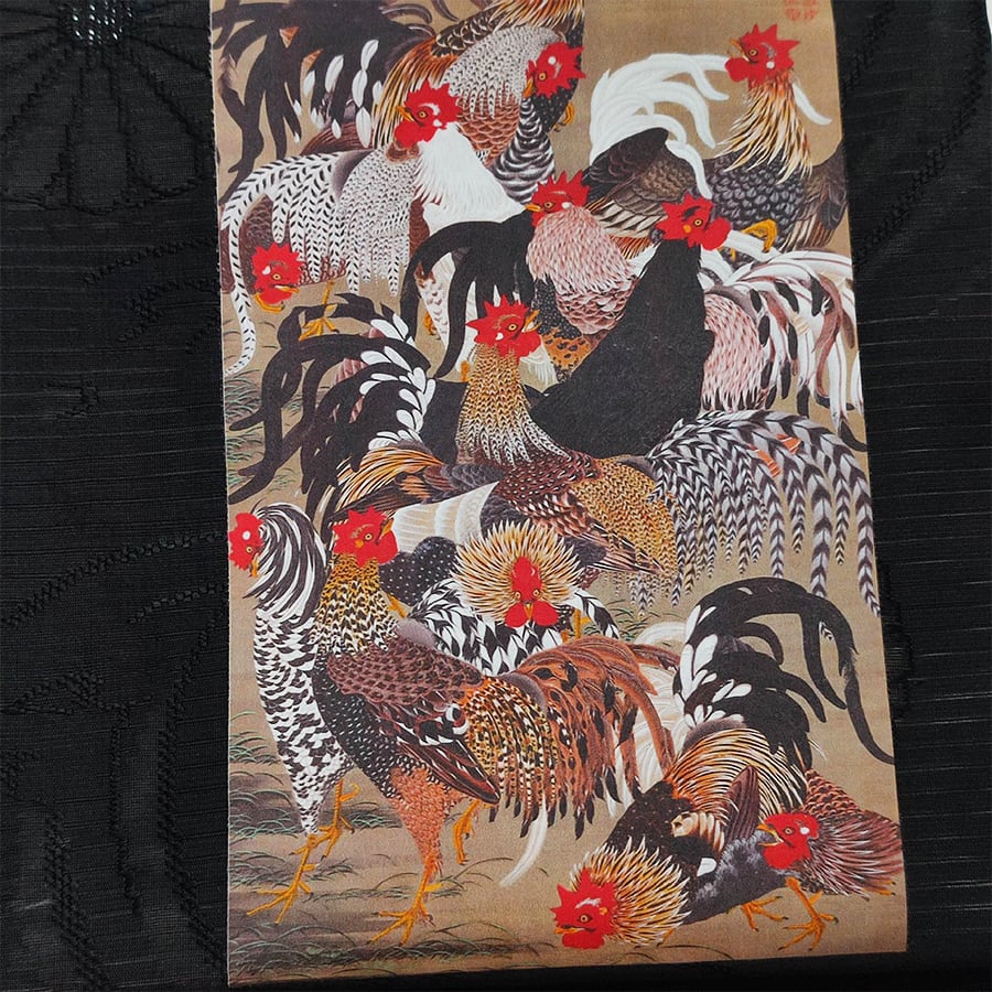 伊藤若冲の群鶏図がプリントされた、黒の名古屋帯です。