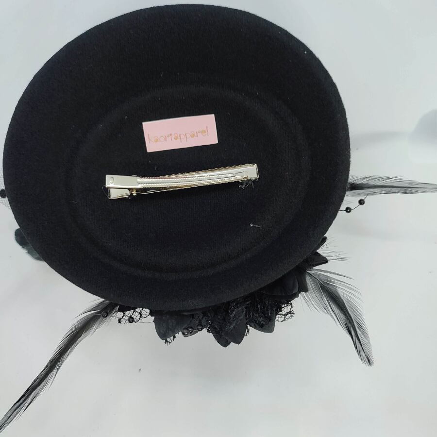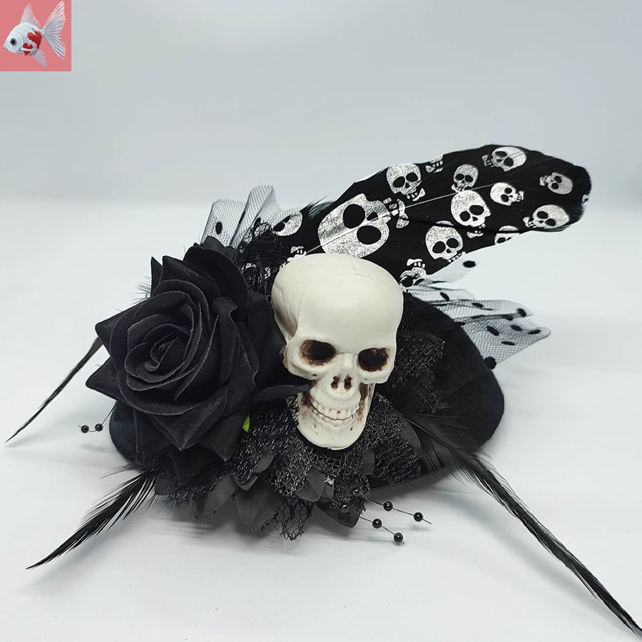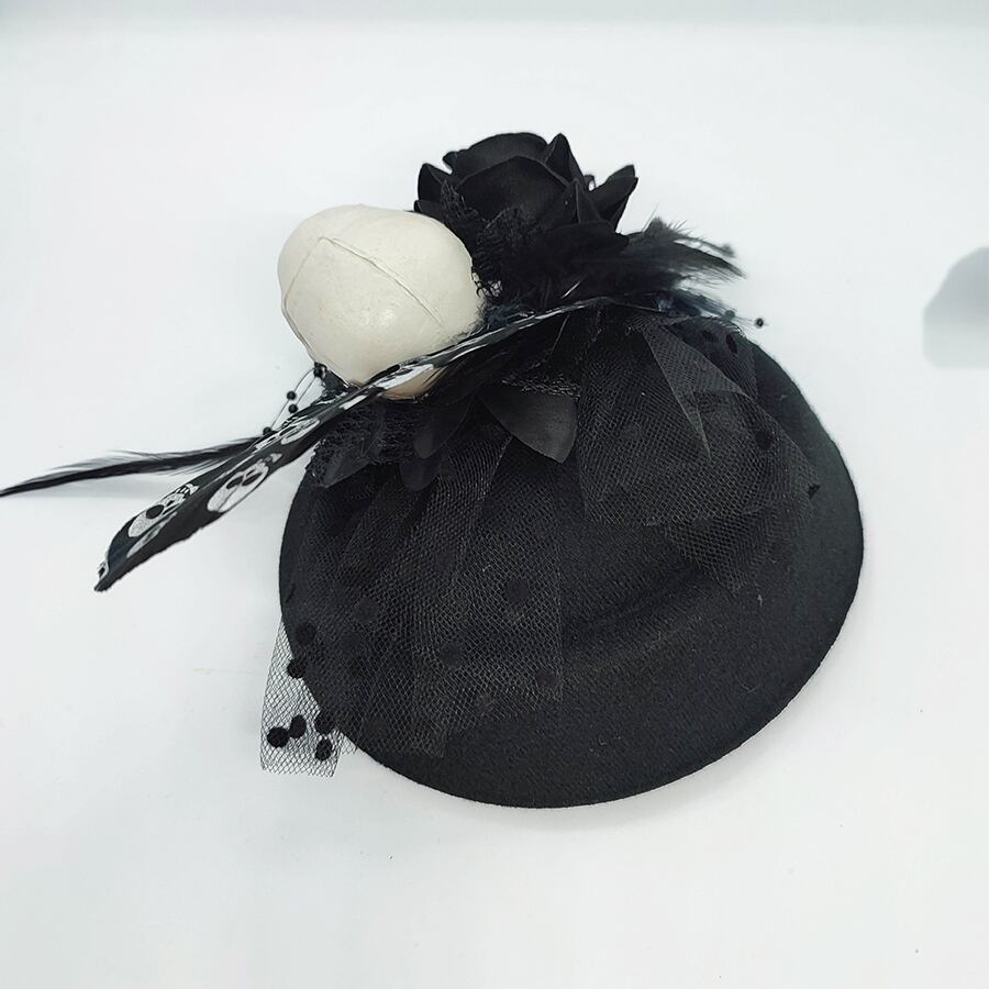 黒のミニハットに、黒い薔薇やスカルヘッドの飾りが付いています。