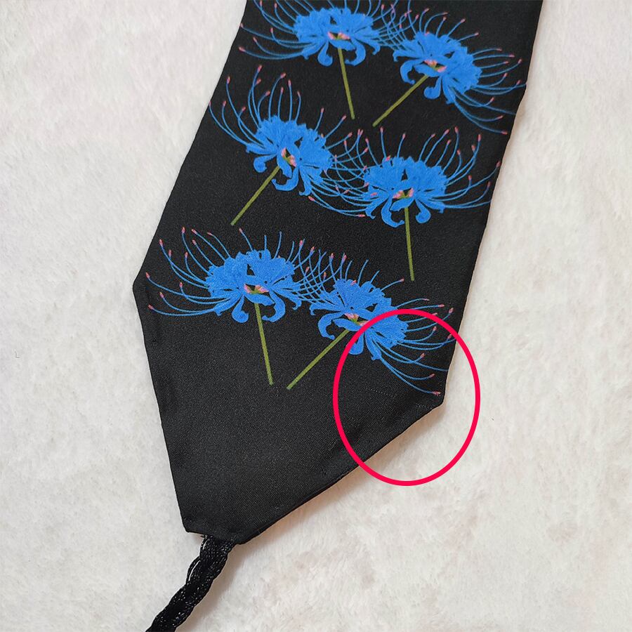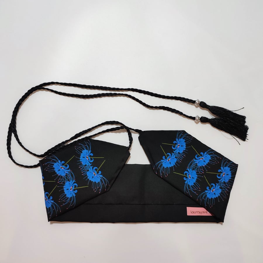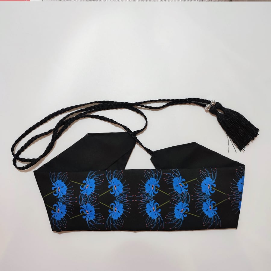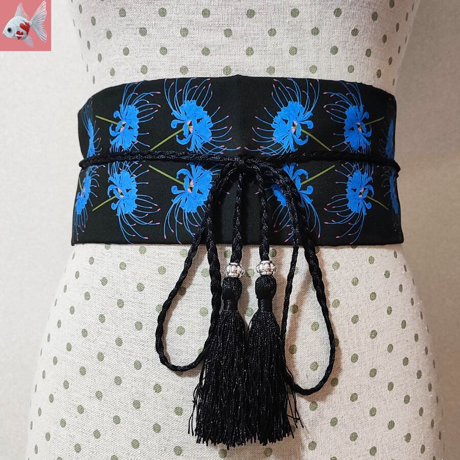 黒地に青の美しい彼岸花柄の和装ベルトです。