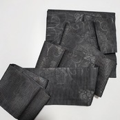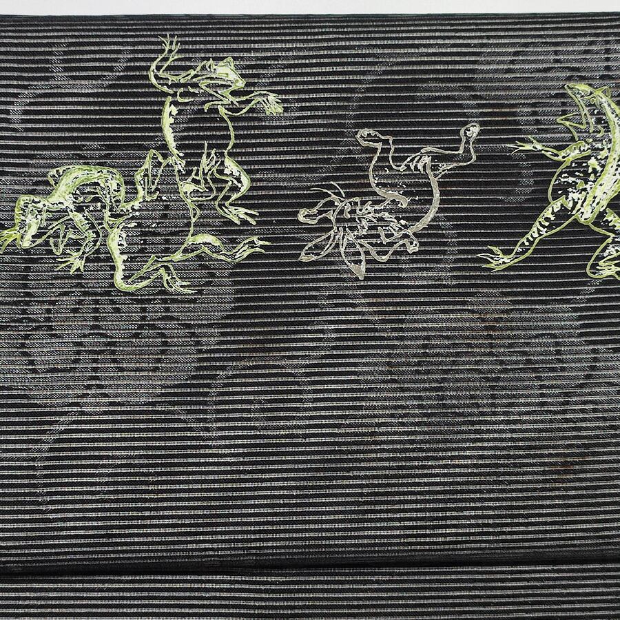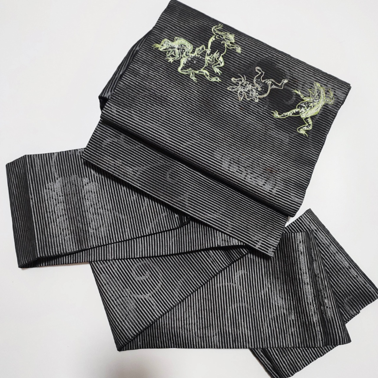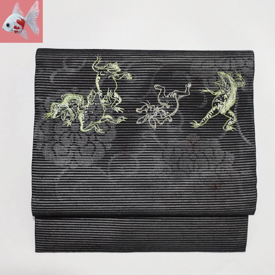 蛙とウサギの鳥獣戯画がプリントされた、黒の名古屋帯です。
