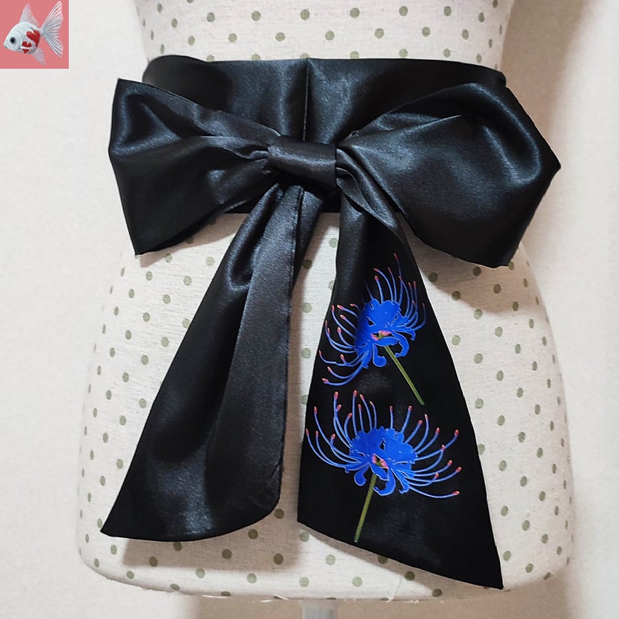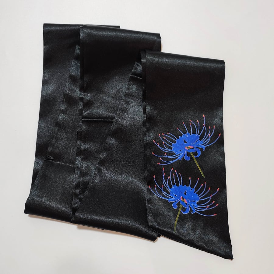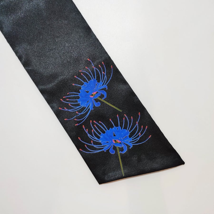 青い彼岸花がプリントされた、紺色のサテンのリボンベルトです。