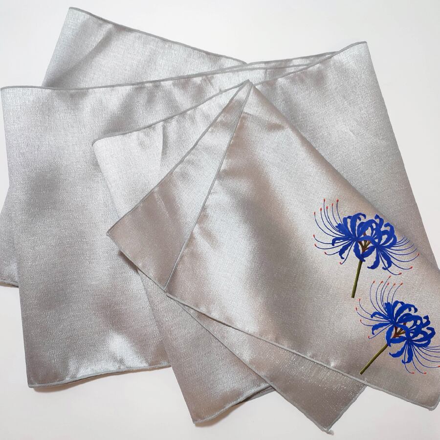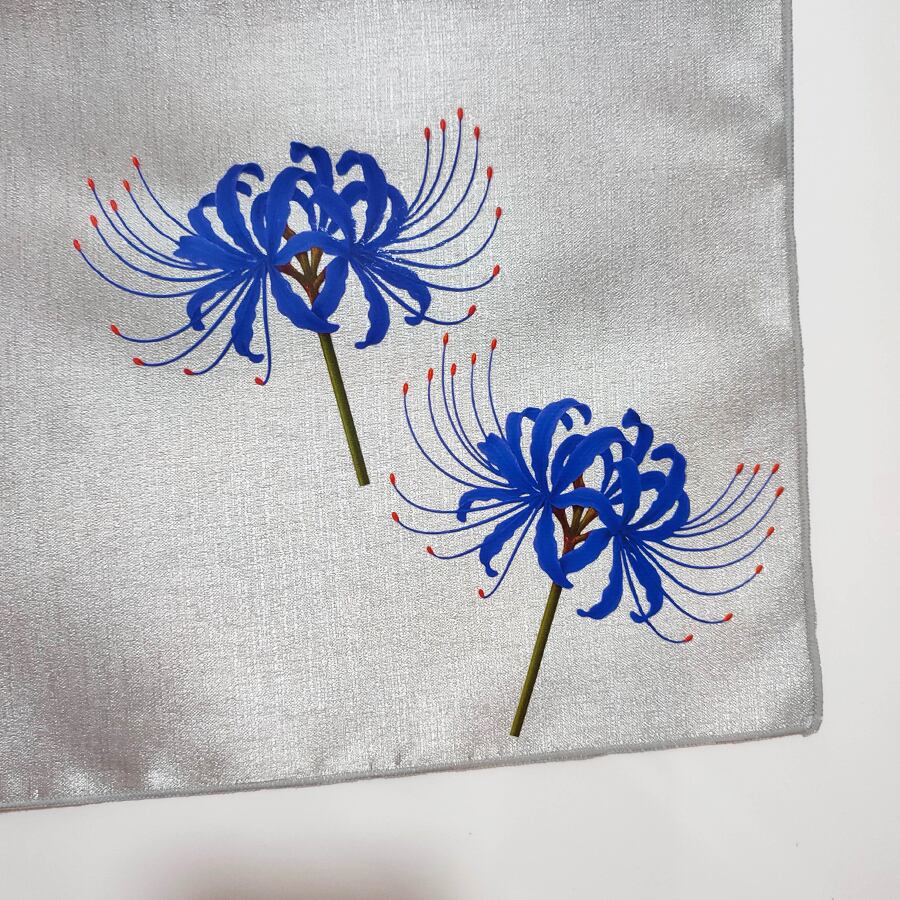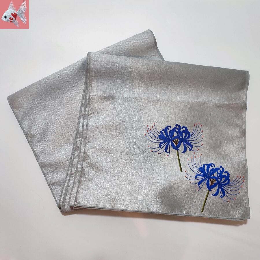 青い彼岸花がプリントされた、薄グレーの兵児帯です。