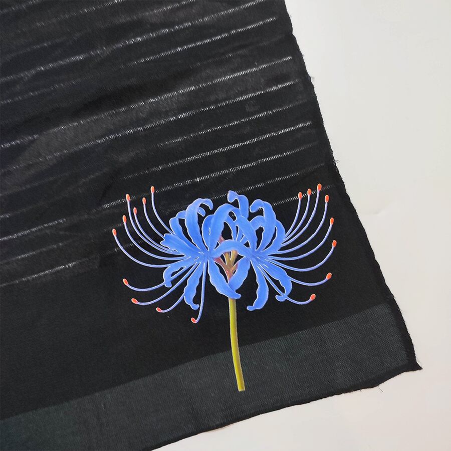 青い彼岸花がプリントされた、黒い帯揚げです。