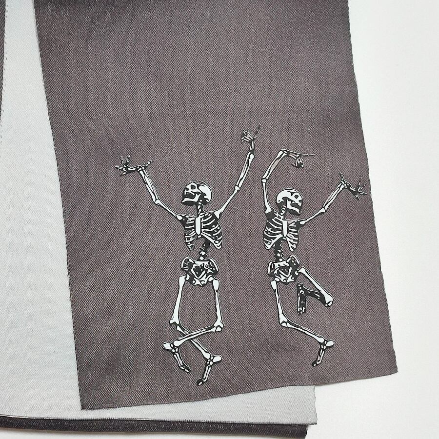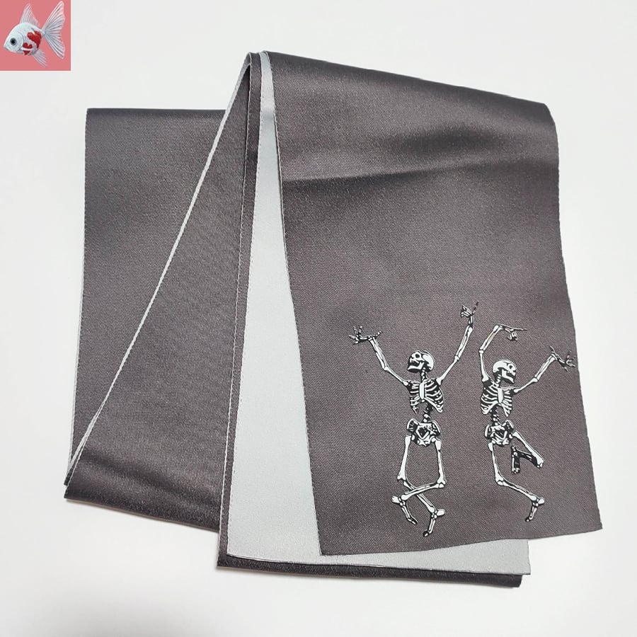踊るスカル達がプリントされた、グレーの半幅帯です。