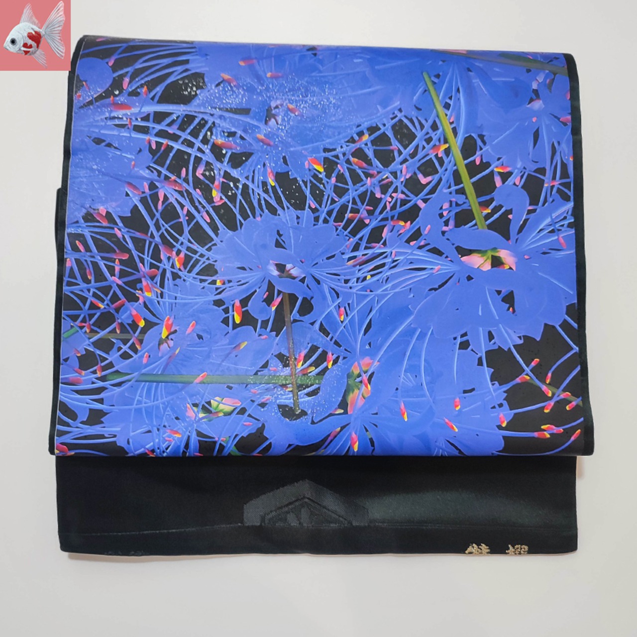 青い彼岸花の柄がプリントされた、黒の名古屋帯です。
