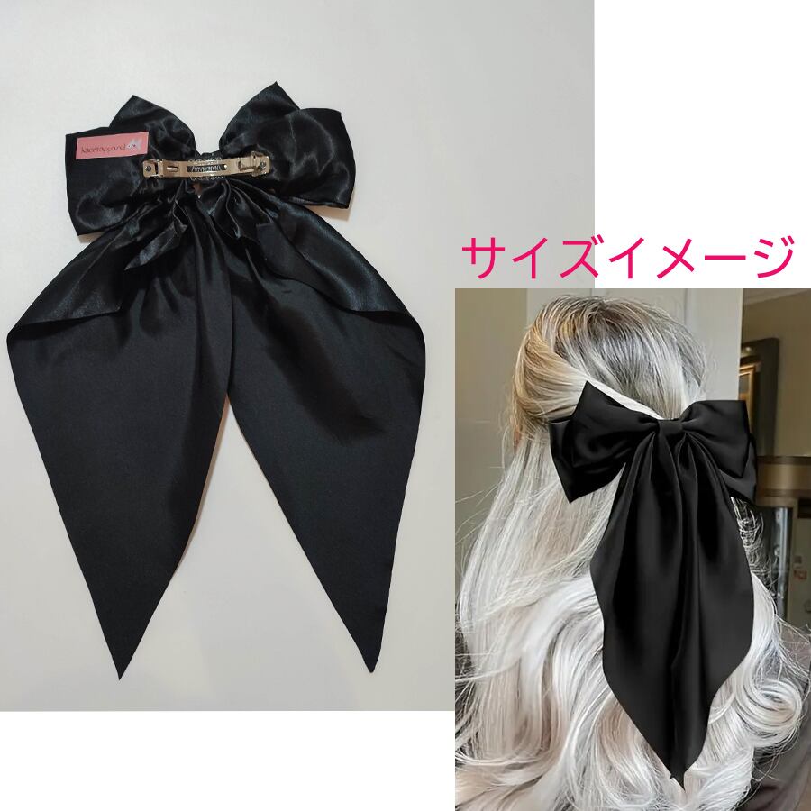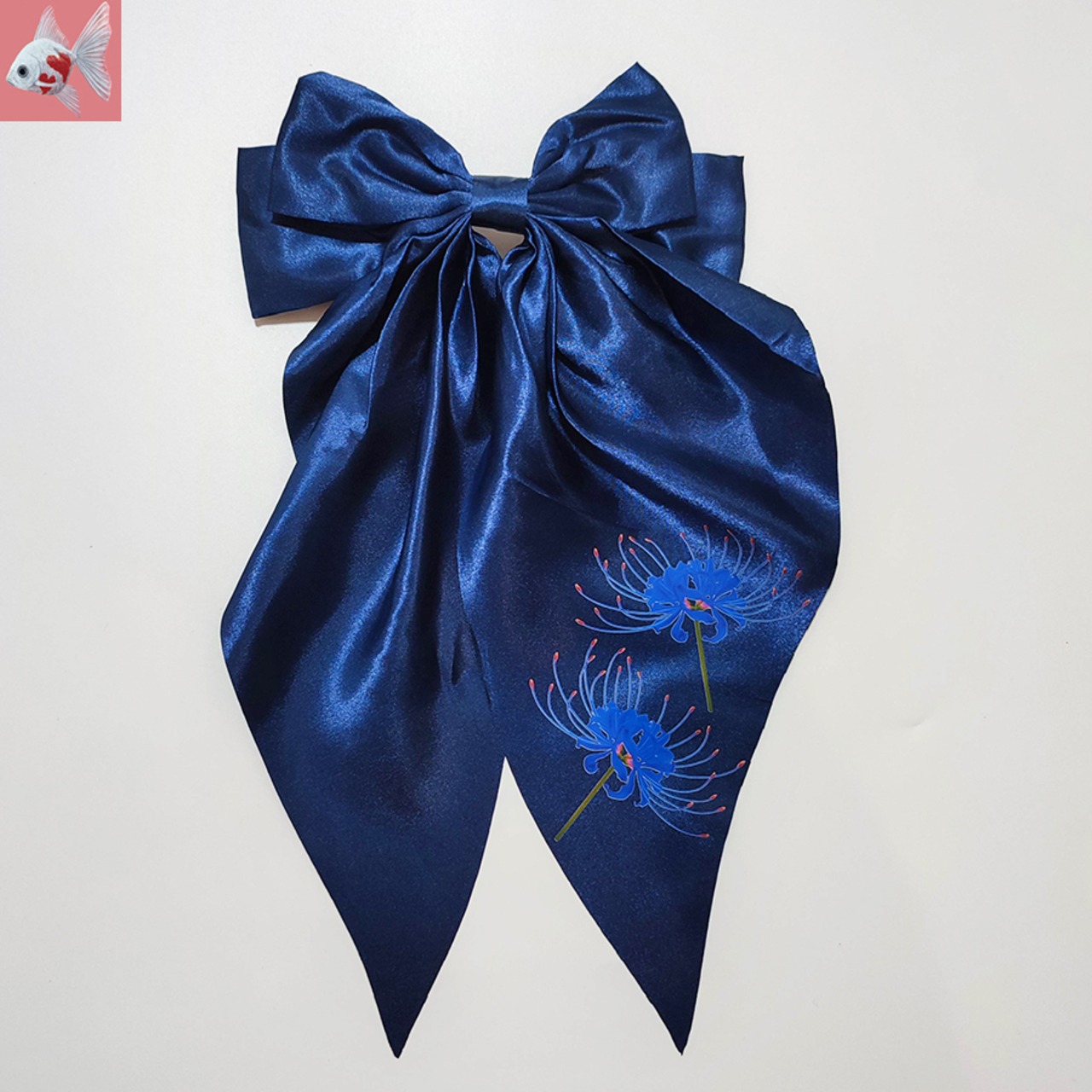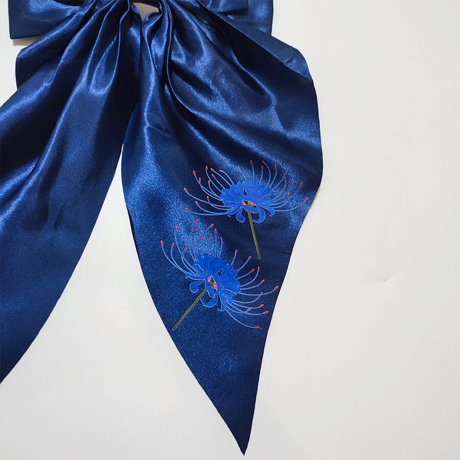 青い彼岸花がプリントされた、紺のサテンのビッグリボンです。