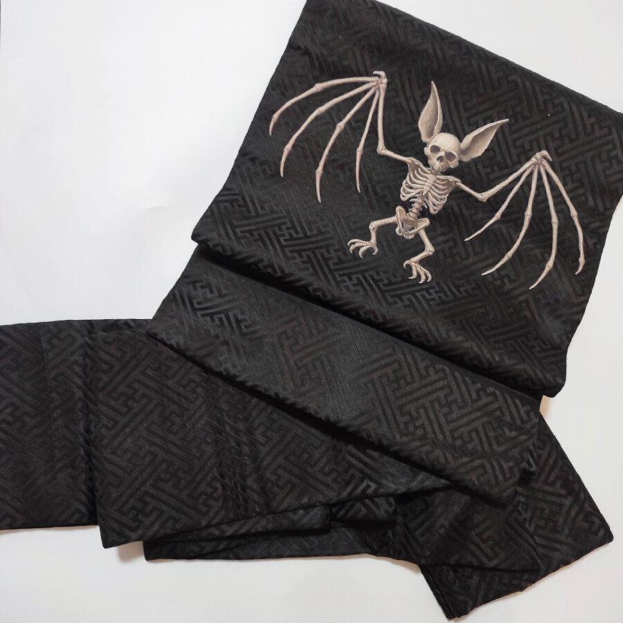 スカルのコウモリがプリントされた、黒の名古屋帯です。