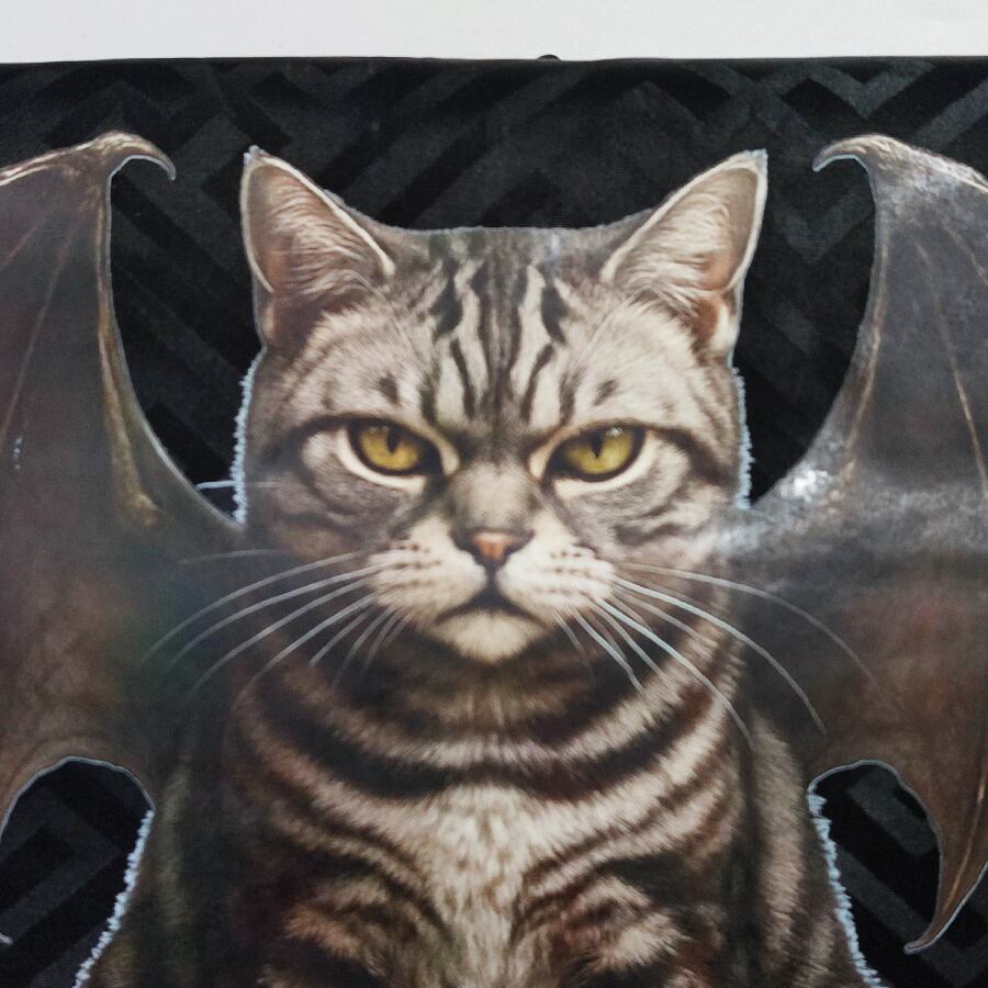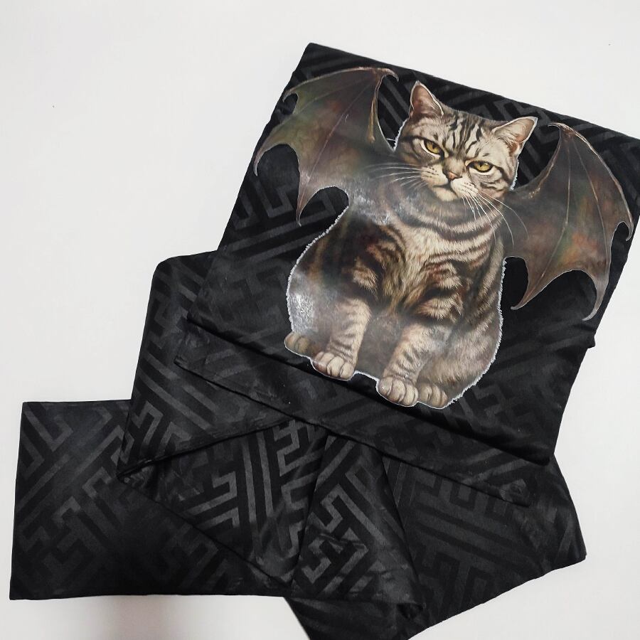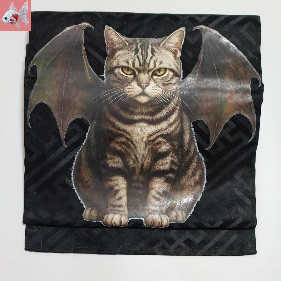 コウモリの羽が付いたアメショー猫がプリントされた、黒の名古屋帯です。