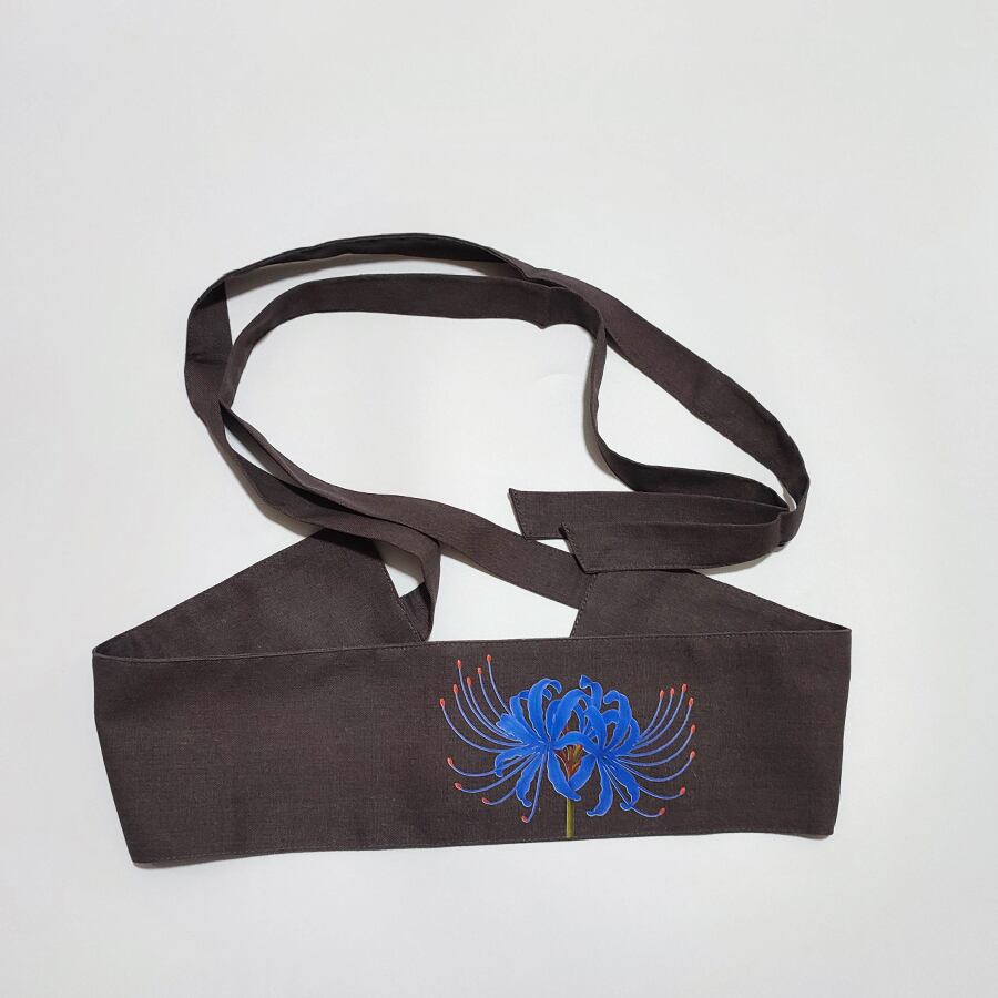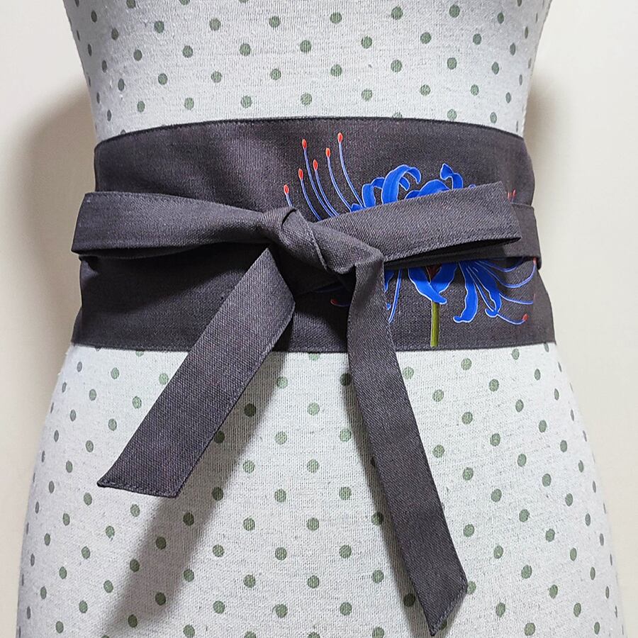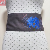 グレーに青の彼岸花がプリントされた和装ベルトです。