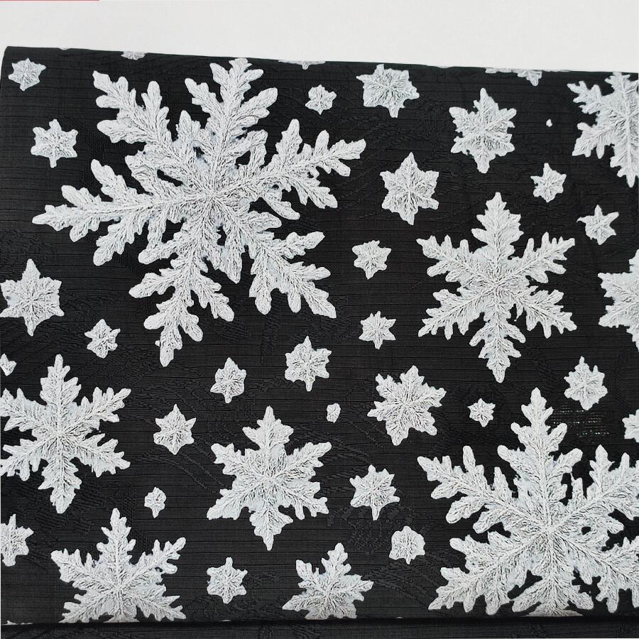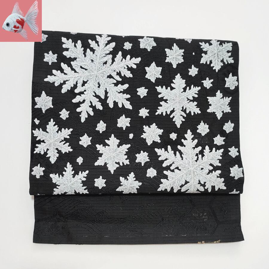 雪の結晶柄がプリントされた、黒の名古屋帯です。