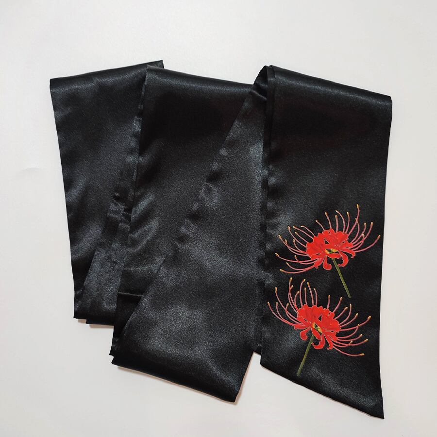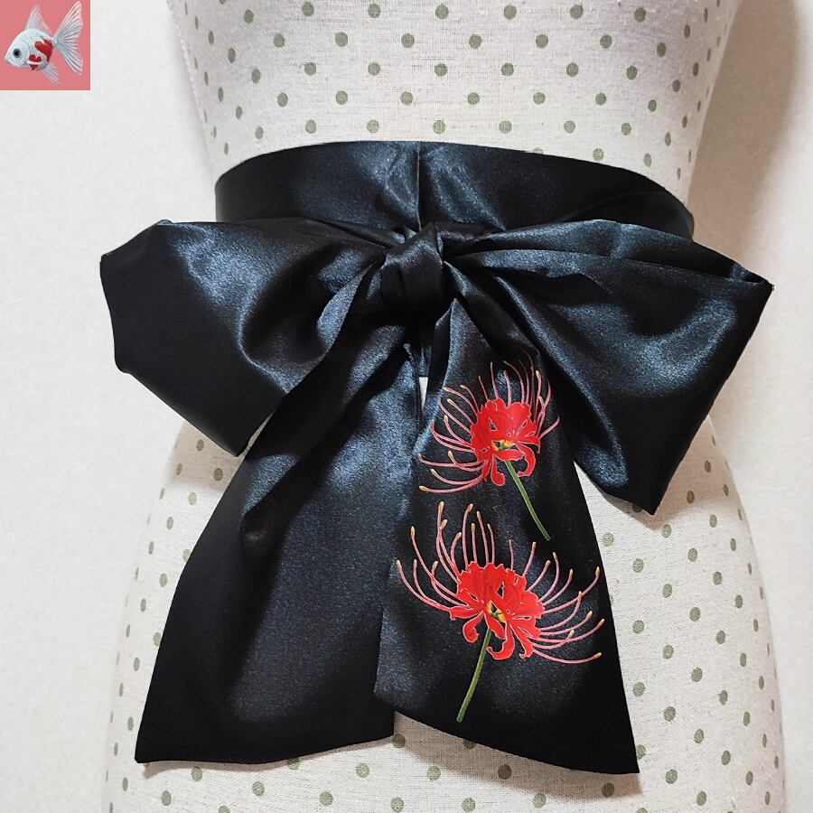 赤い彼岸花がプリントされた、黒のサテンのリボンベルトです。