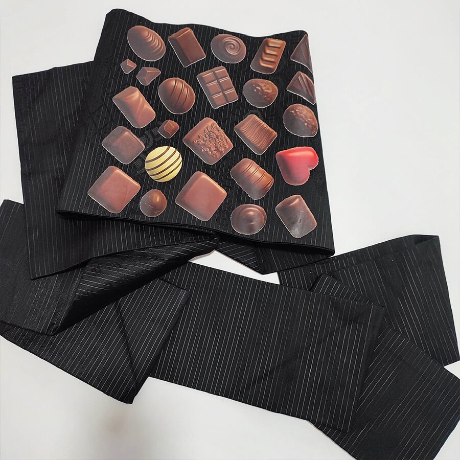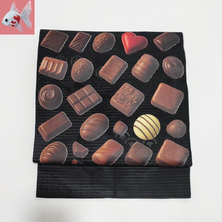 可愛いチョコレートがプリントされた、黒の名古屋帯です。