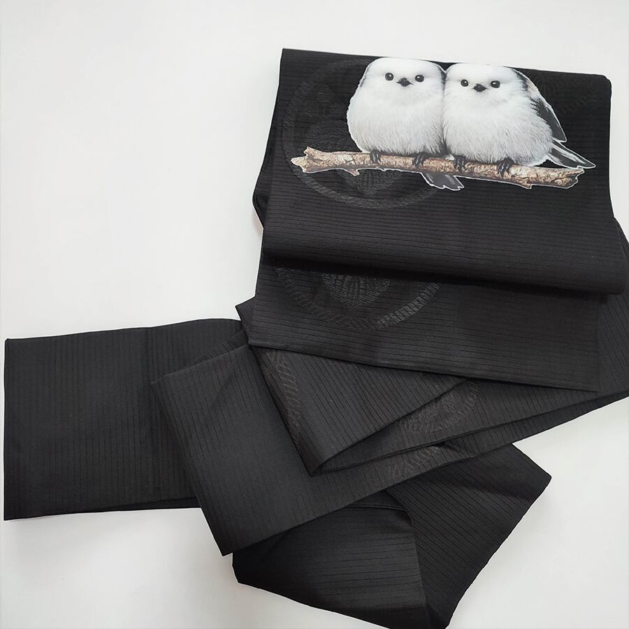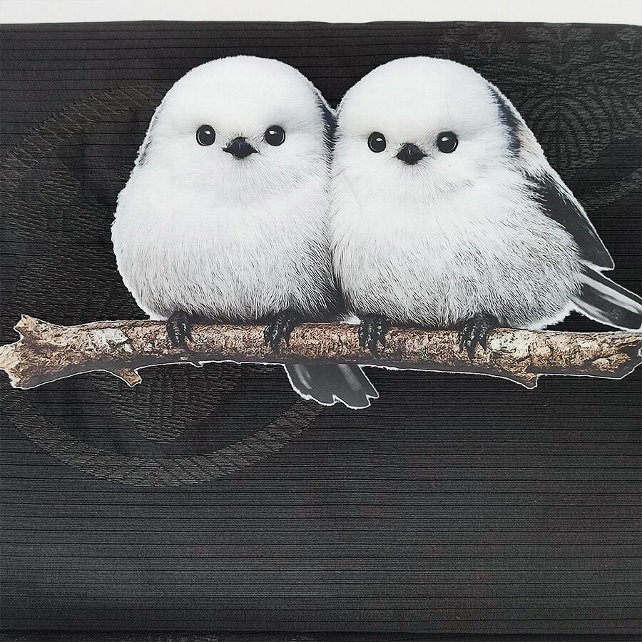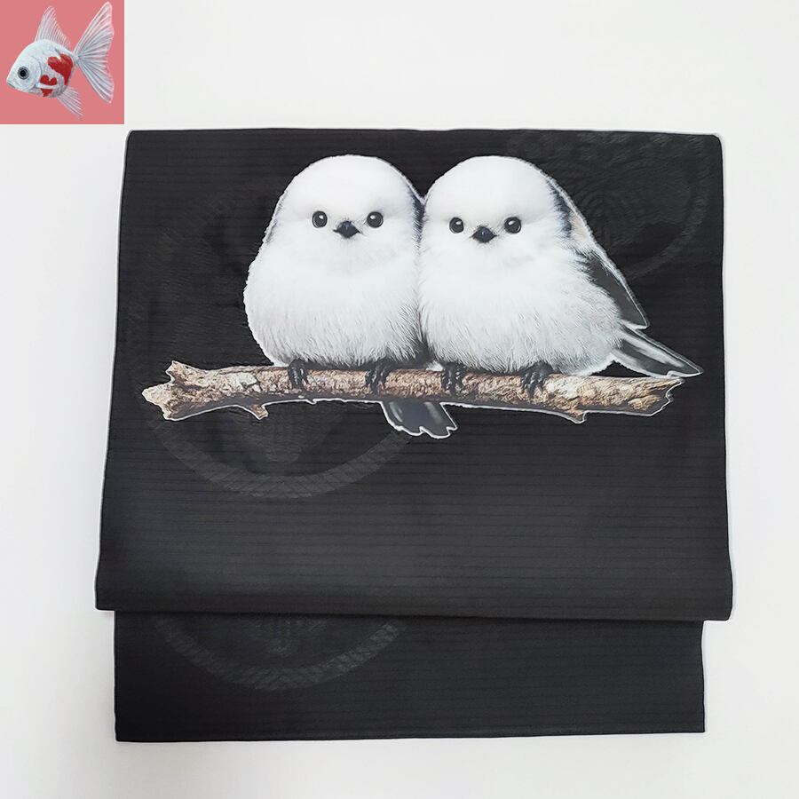 寄り添うシマエナガちゃんがプリントされた、黒の名古屋帯です。